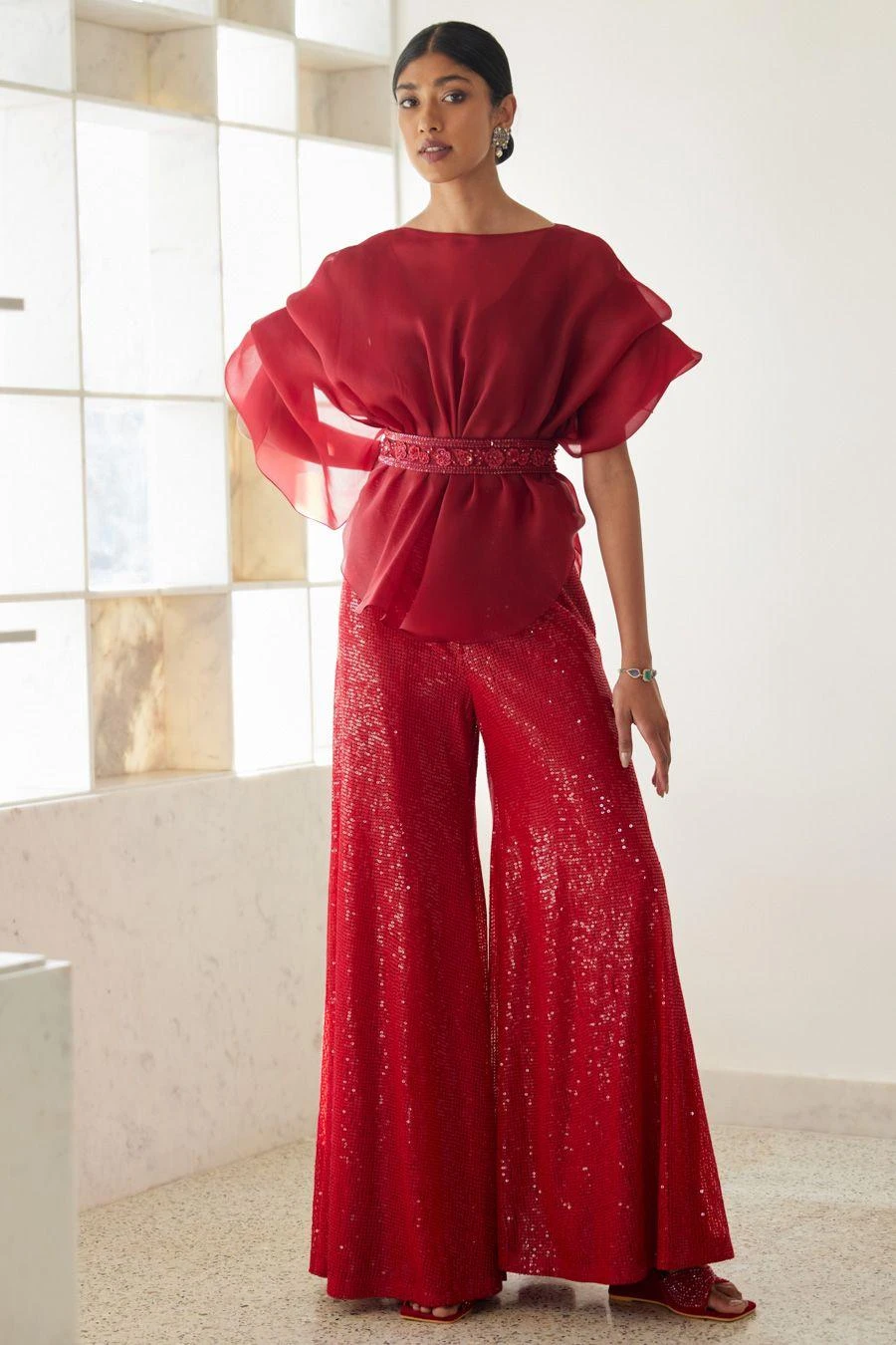 Ditch the traditional kurta sets this festive season with this red co-ord set. It comes with a pouf top with flared pants, a bustier & a belt. Style this set with statement earrings to complete the look.