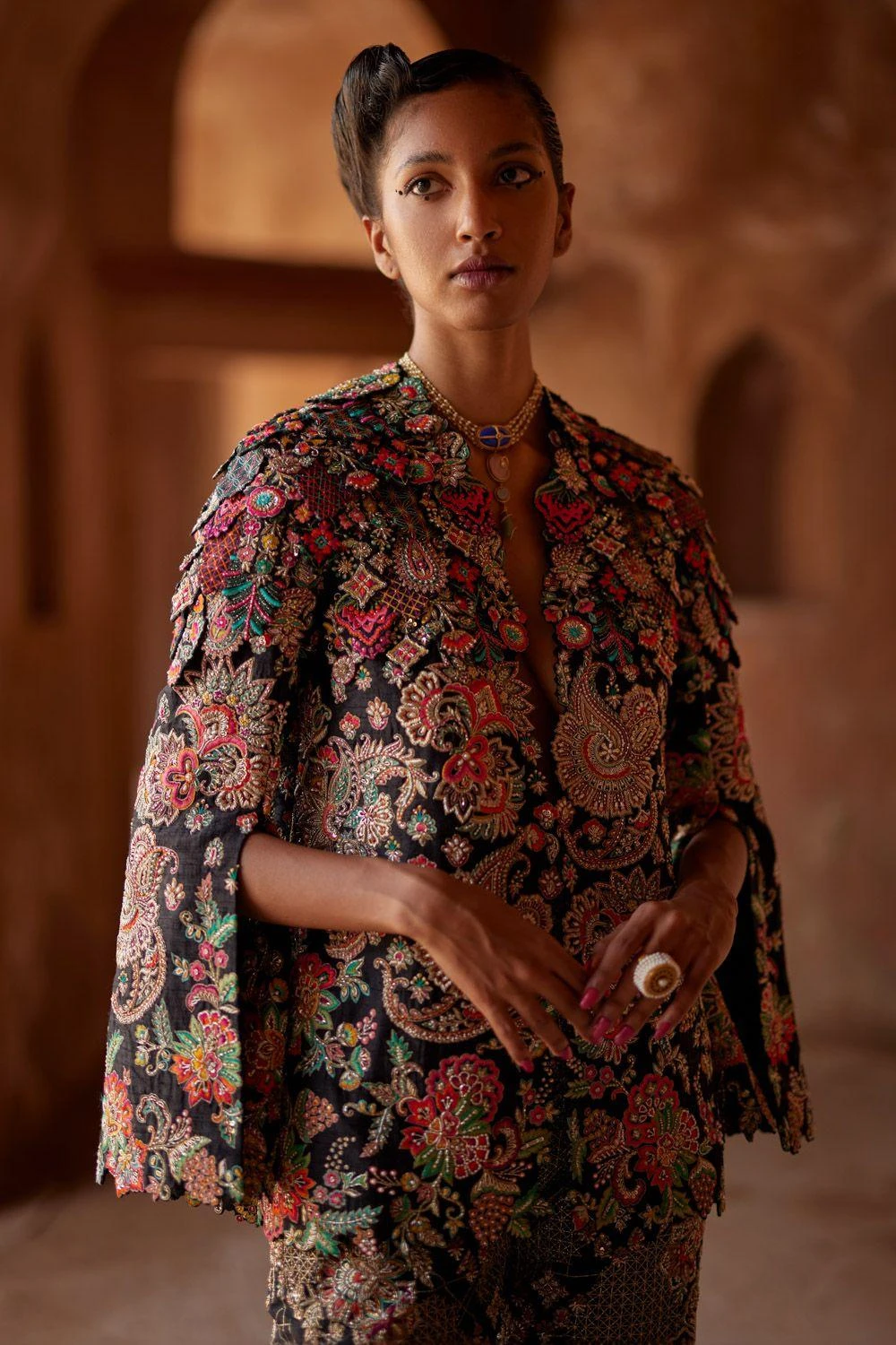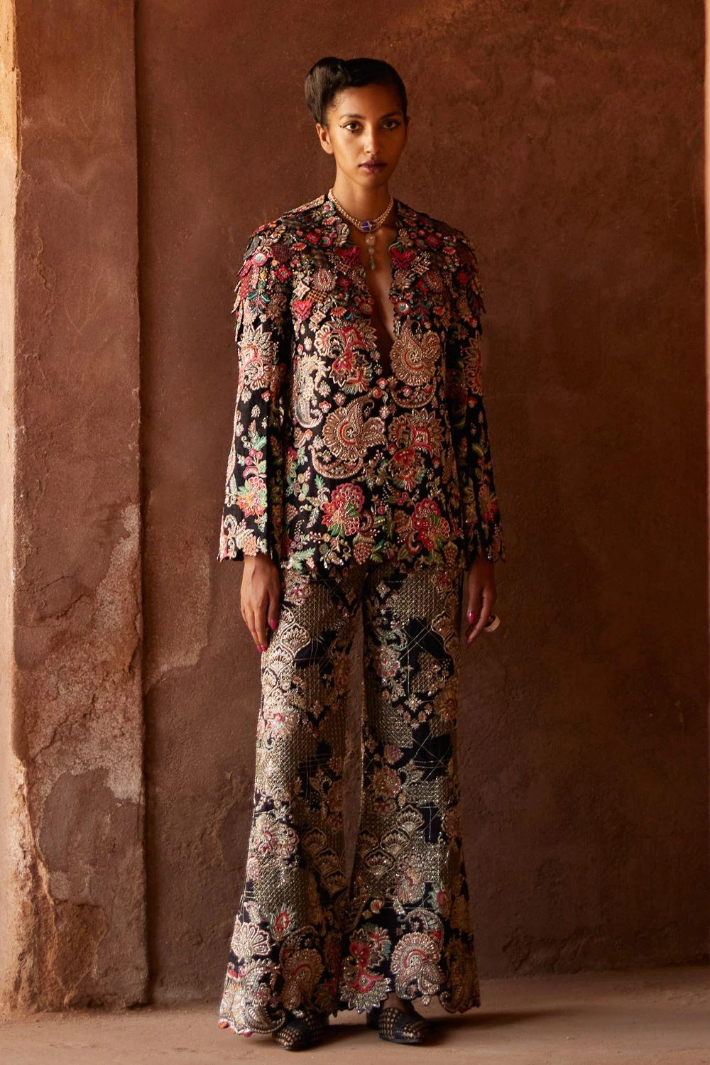 Indulge in sophistication with this semi-fit jacket, graced by resham and zardozi hand embroidery and captivating 3-D texture. It is paired flawlessly with flared pants adorned with resham and zardozi hand embroidery, enhancing the checks texture.