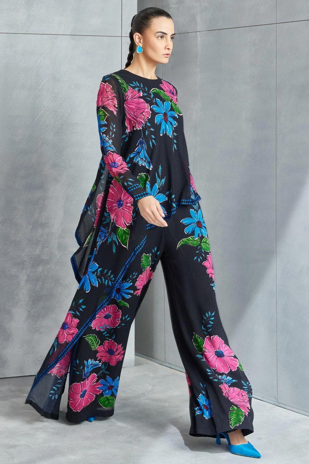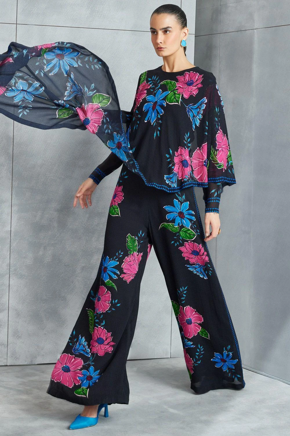 Elevate your style with the Zinnia Cape Jumpsuit. Effortlessly chic, the cape adds a touch of drama to this modern ensemble, perfect for making a statement. Add a pair of dangler earrings to complete the look.
