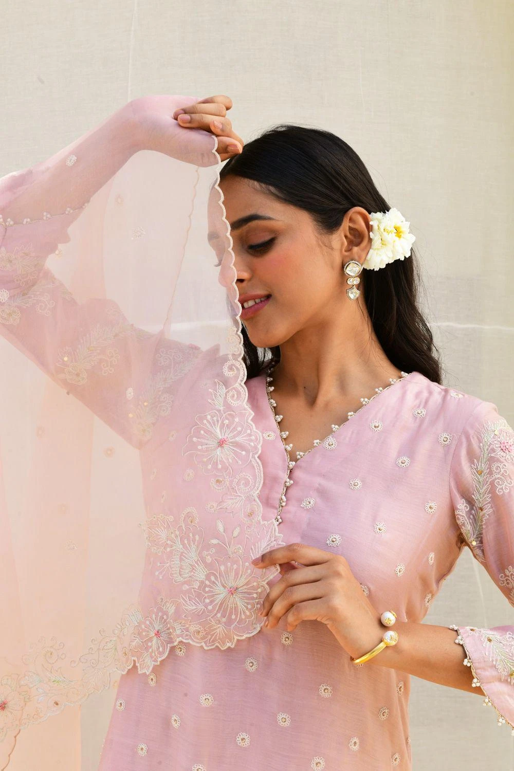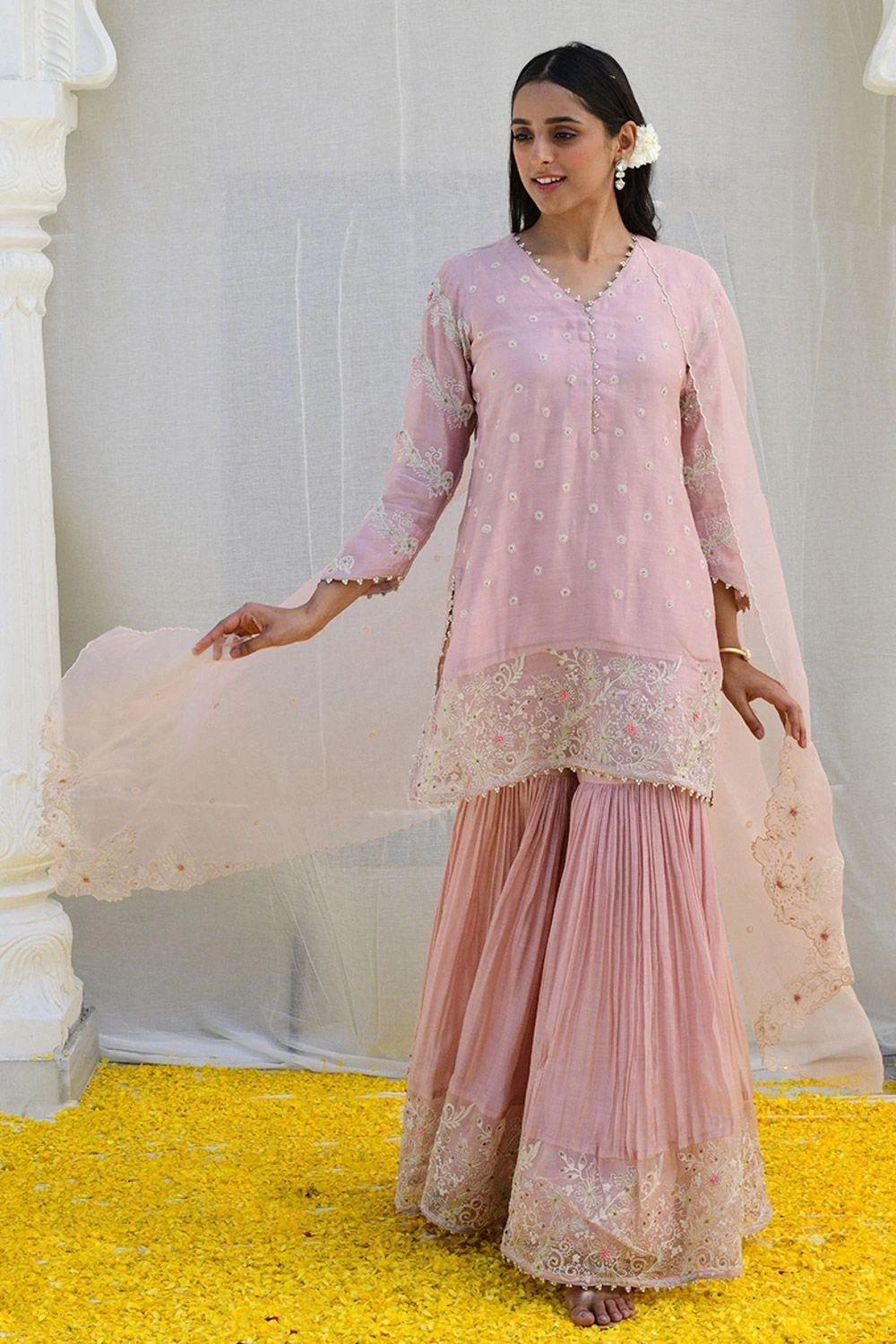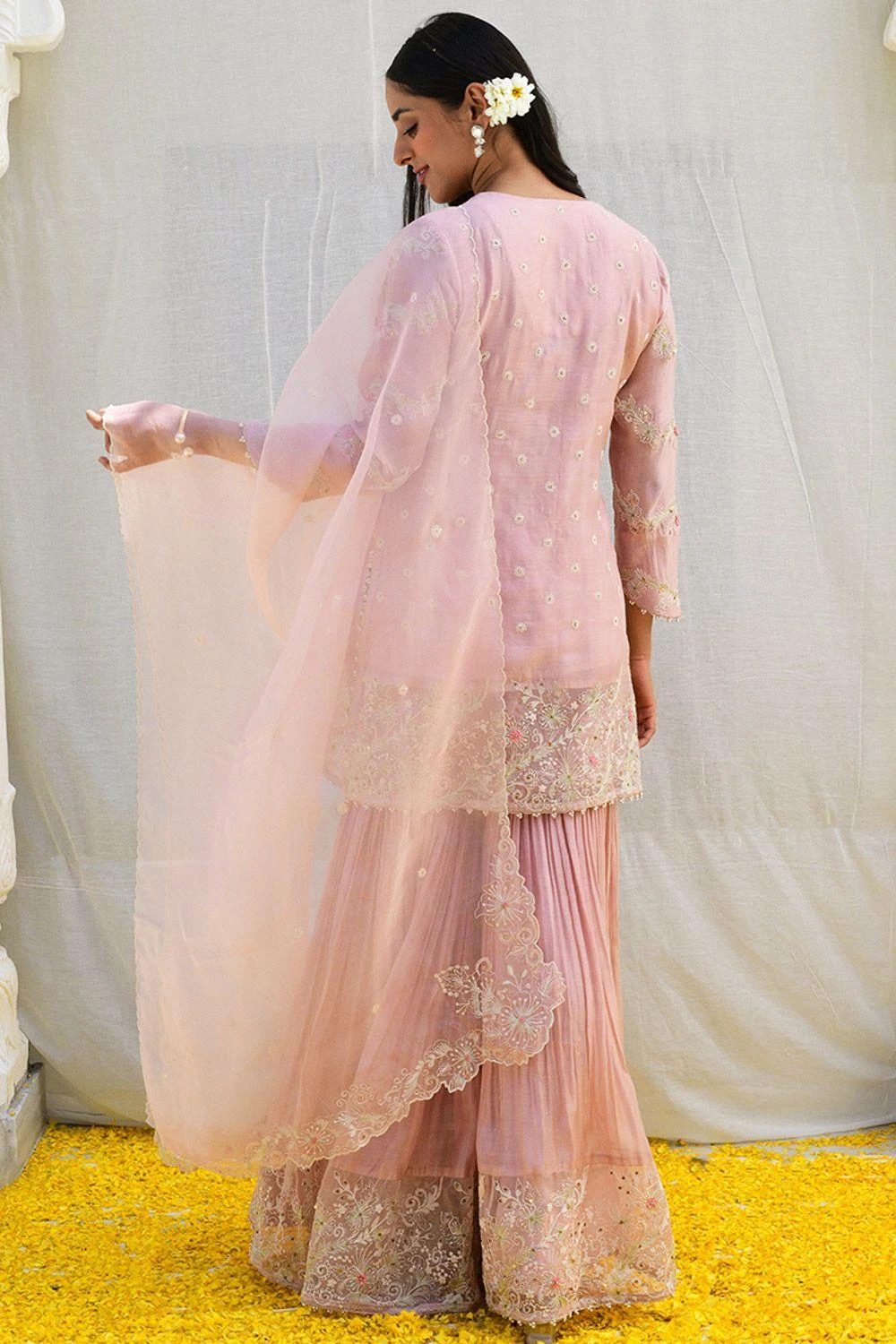 The perfect amalgamation of style and comfort, this sharara set is perfect for daytime festivities. Crafted in silk, this set features a kurta embroidered with a delicate dori jaal paired with a coordinating sharara & dupatta.