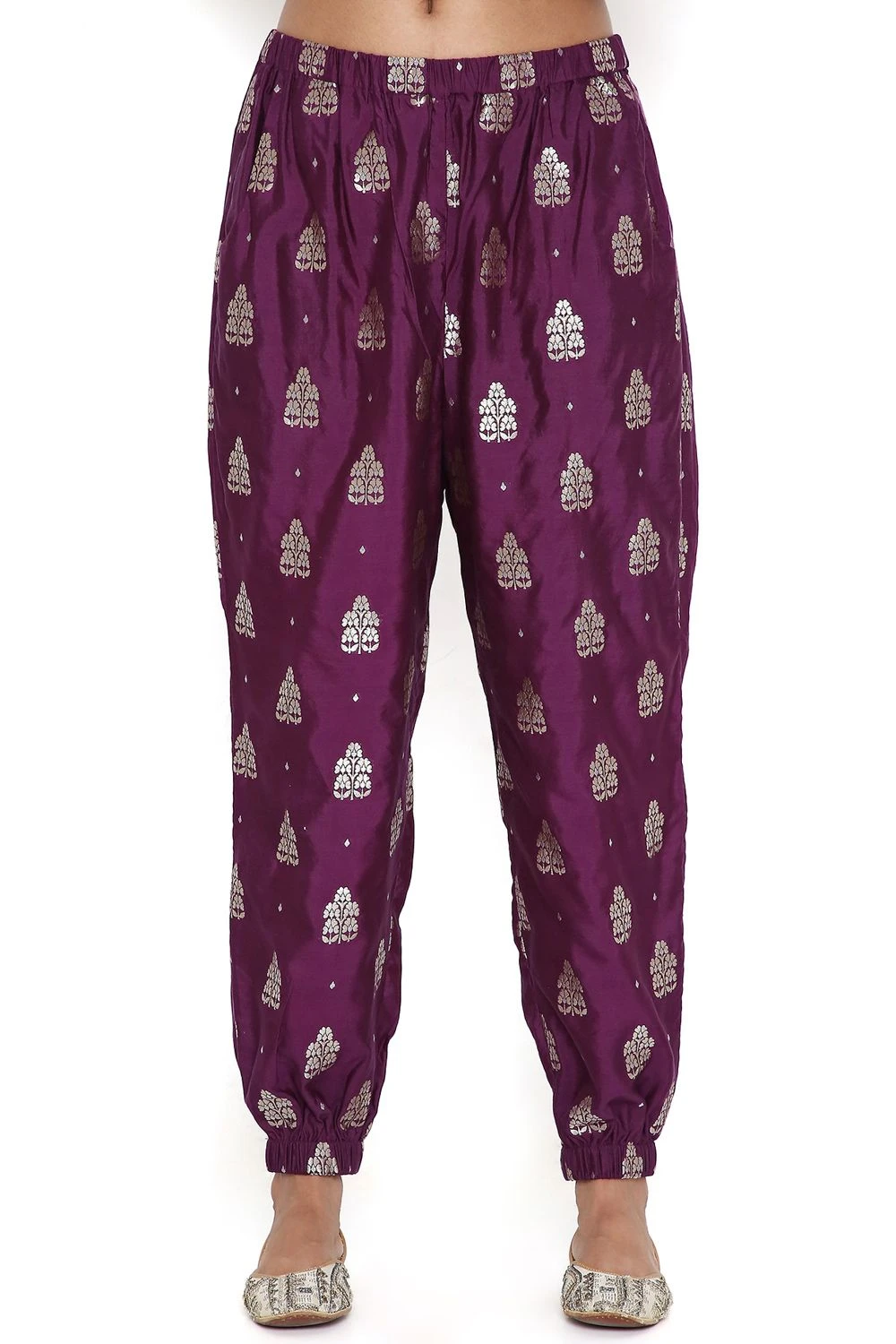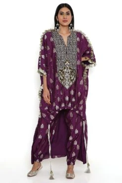Step into elegance with this purple banarasi high low kurta, perfectly paired with jogger pants. This ensemble exudes a seamless blend of style and comfort, a statement of sophistication.