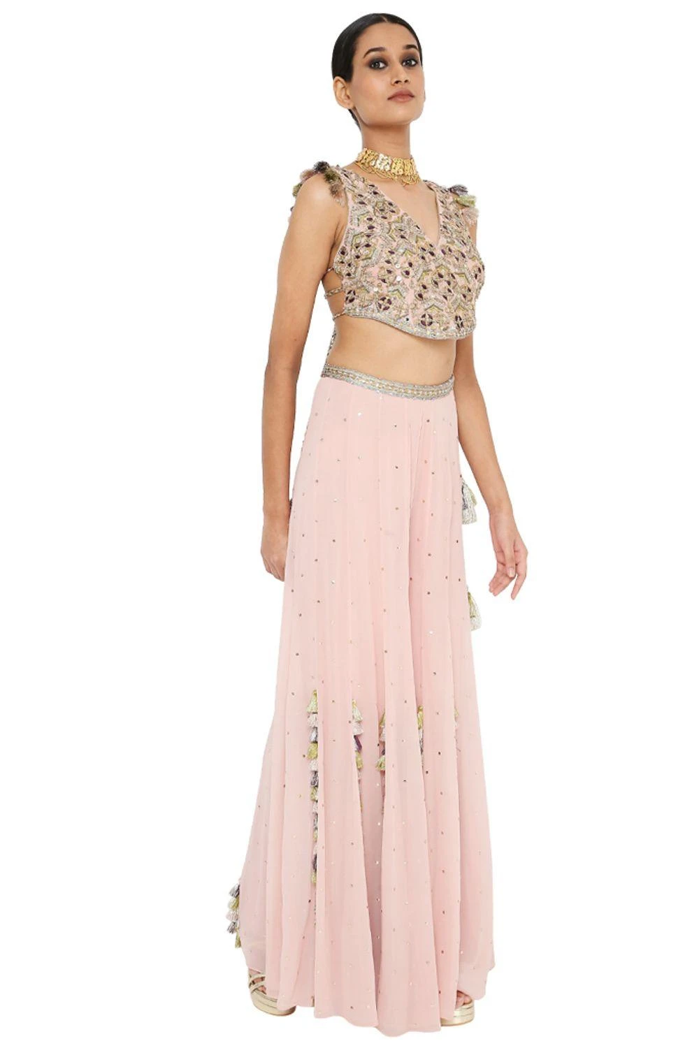 Take your bridesmaid look a notch higher in this rose pink sharara set. It features a georgette embroidered back tie-up blouse, paired with panelled georgette sharara pants. Style this look with a chic choker.