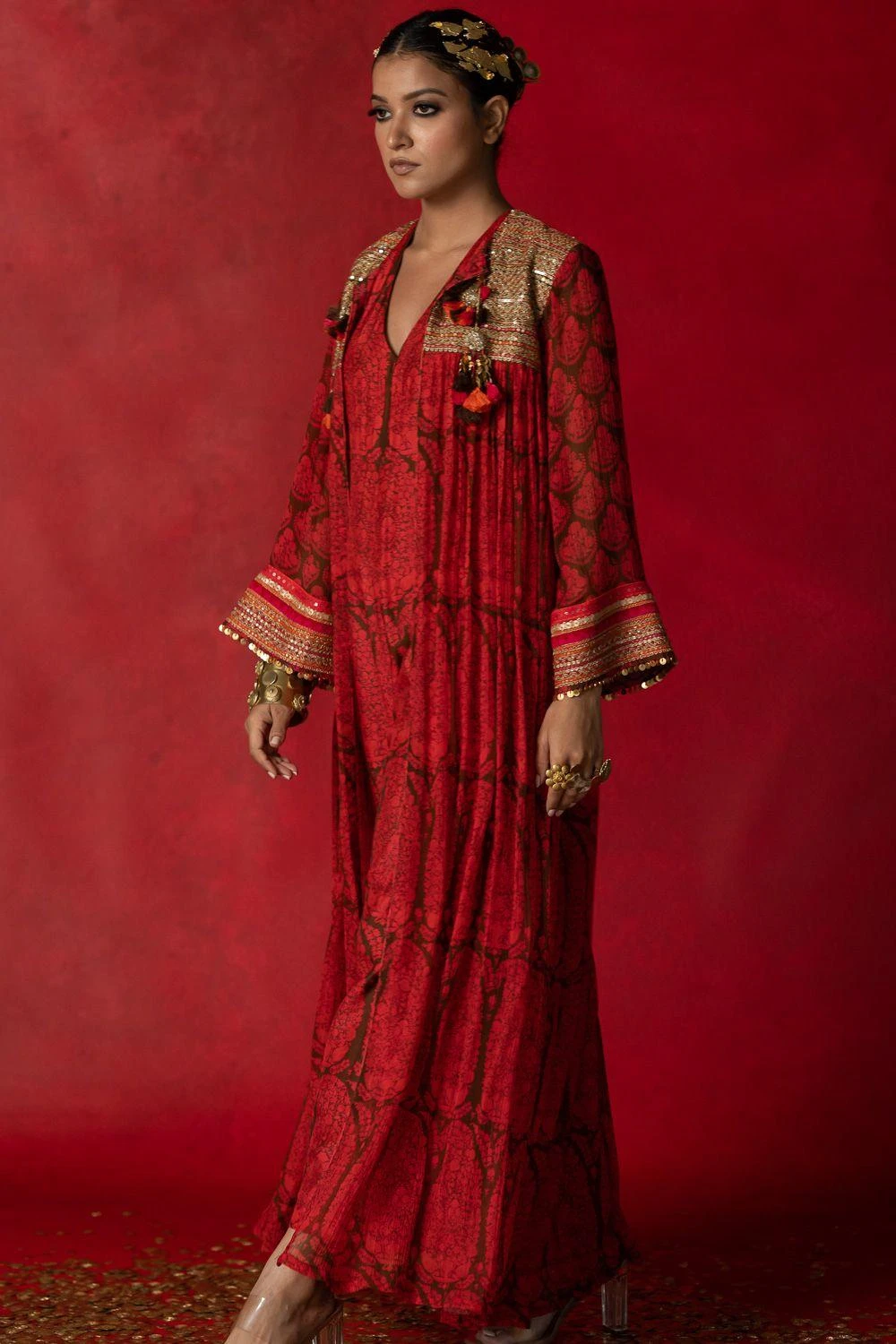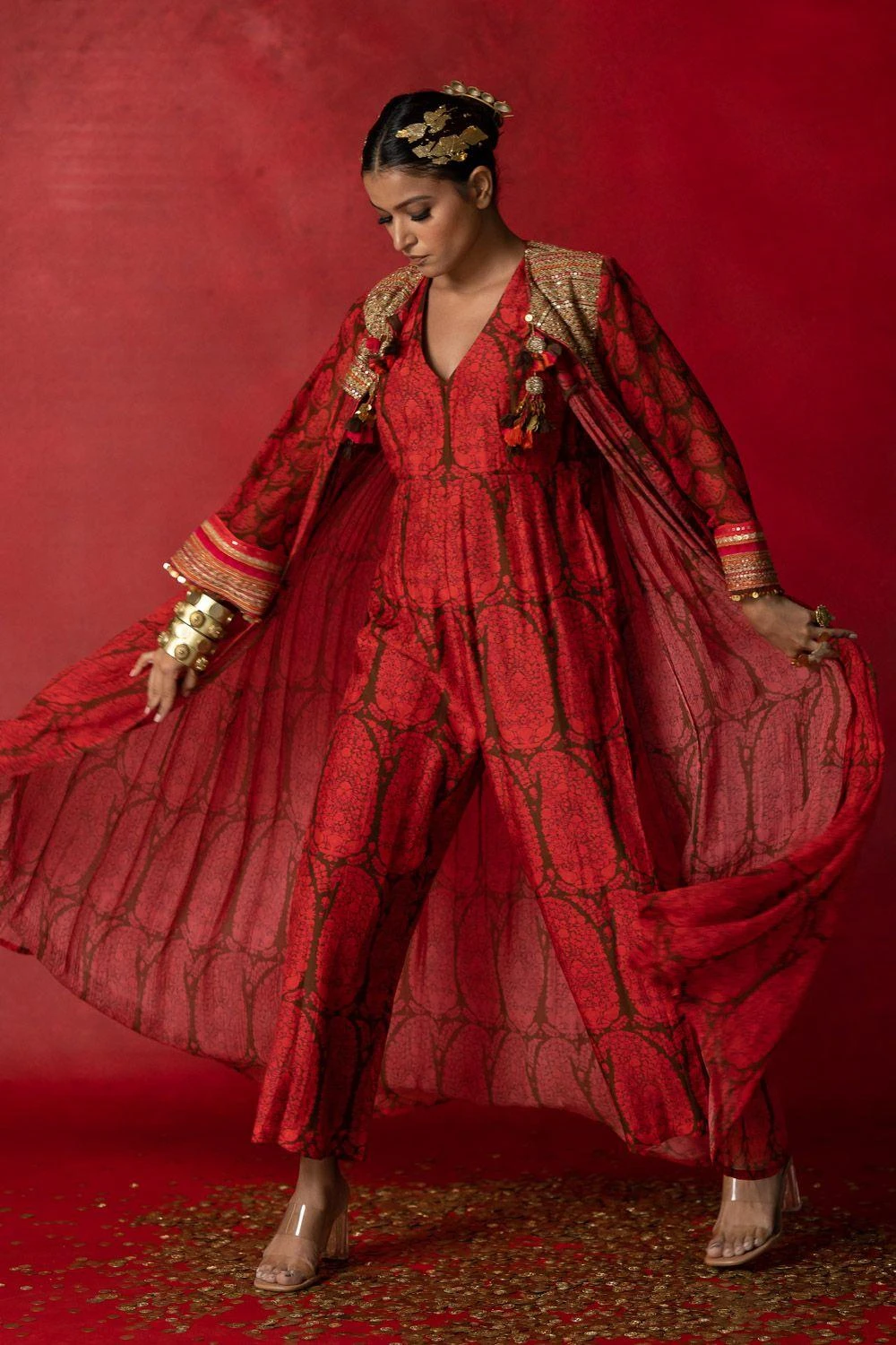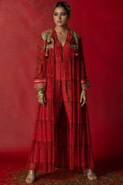Give your festive closet a vibrant, artisan aesthetic with this overlay jacket. Crafted in chiffon, this jacket features a paisley print & aari embroidered details. Style it with a pair of statement earrings to complete the look.
