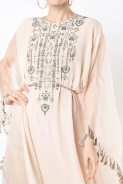 Elevate your style with this kaftan set, adorned with hand-embroidered mirror-like coin & reflective sequin lace, radiating a celestial charm. The ensemble is elegantly finished with hand-folded coin sequin lace, creating a mesmerizing starlit aura.
