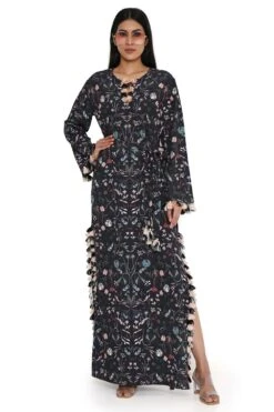 Step into sophistication with this black forest print art crepe long beyza kaftan. A harmonious blend of style and comfort, this piece exudes a timeless charm that’s perfect for any occasion.