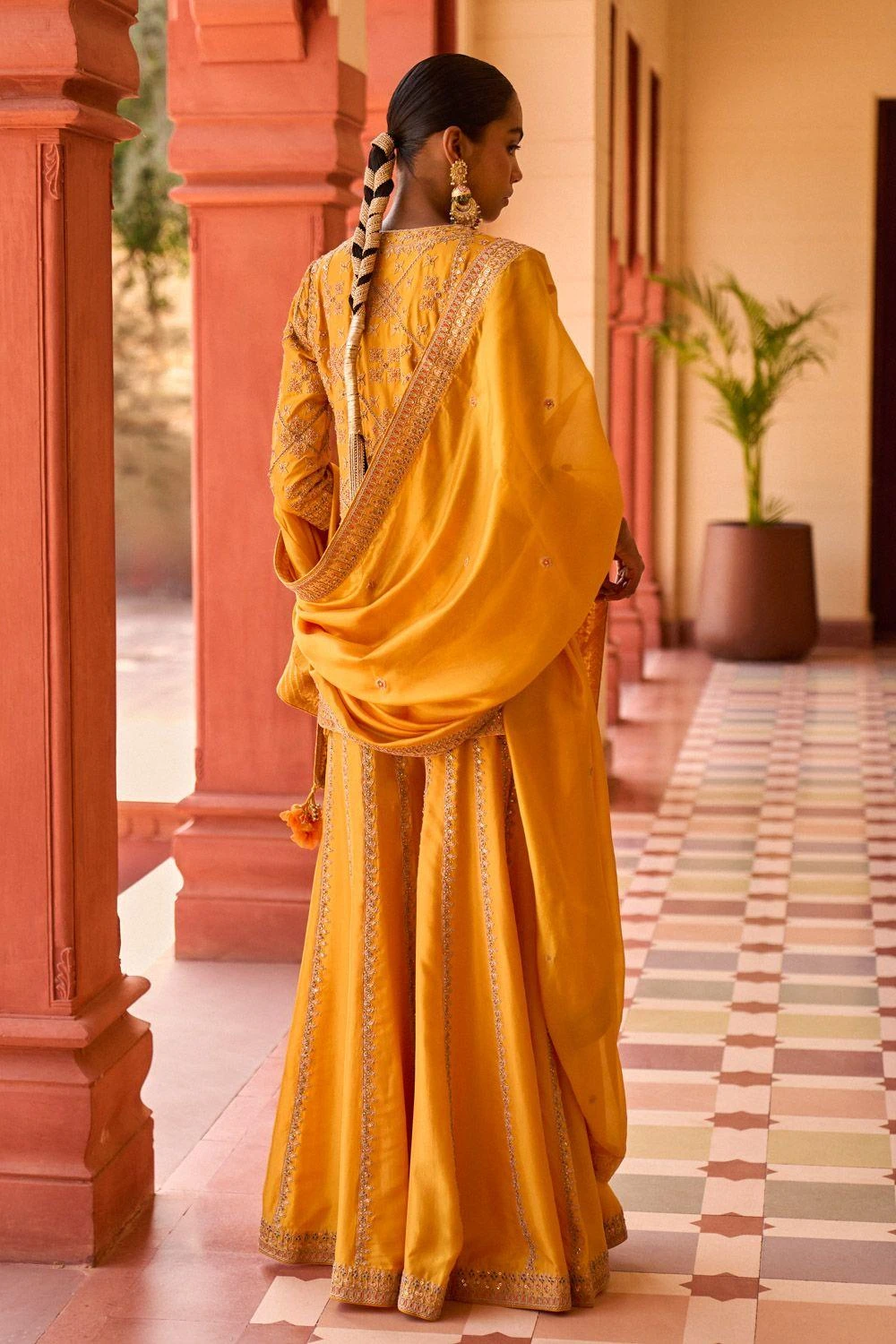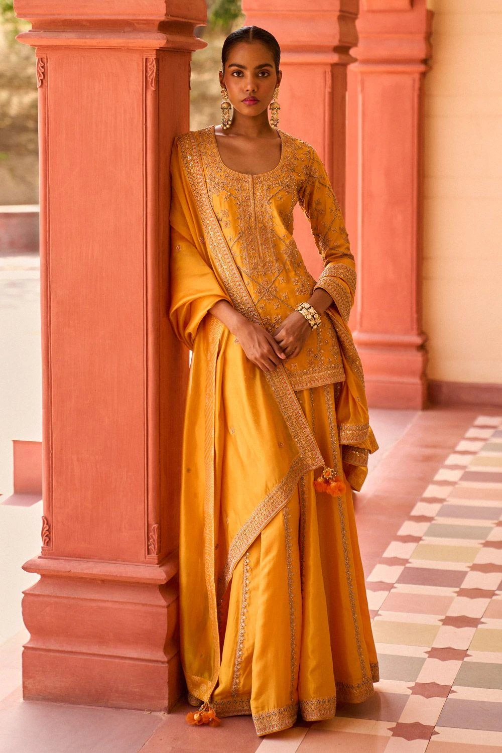 Step into the world of timeless elegance with this Kasundi Jodha Sharara Set. The Gota, Marodi work radiates brilliance, while the ‘Chadhi Ka Kaam’ on the sharara adds a regal touch. With its flowy design, this set promises comfort & easy movement.
