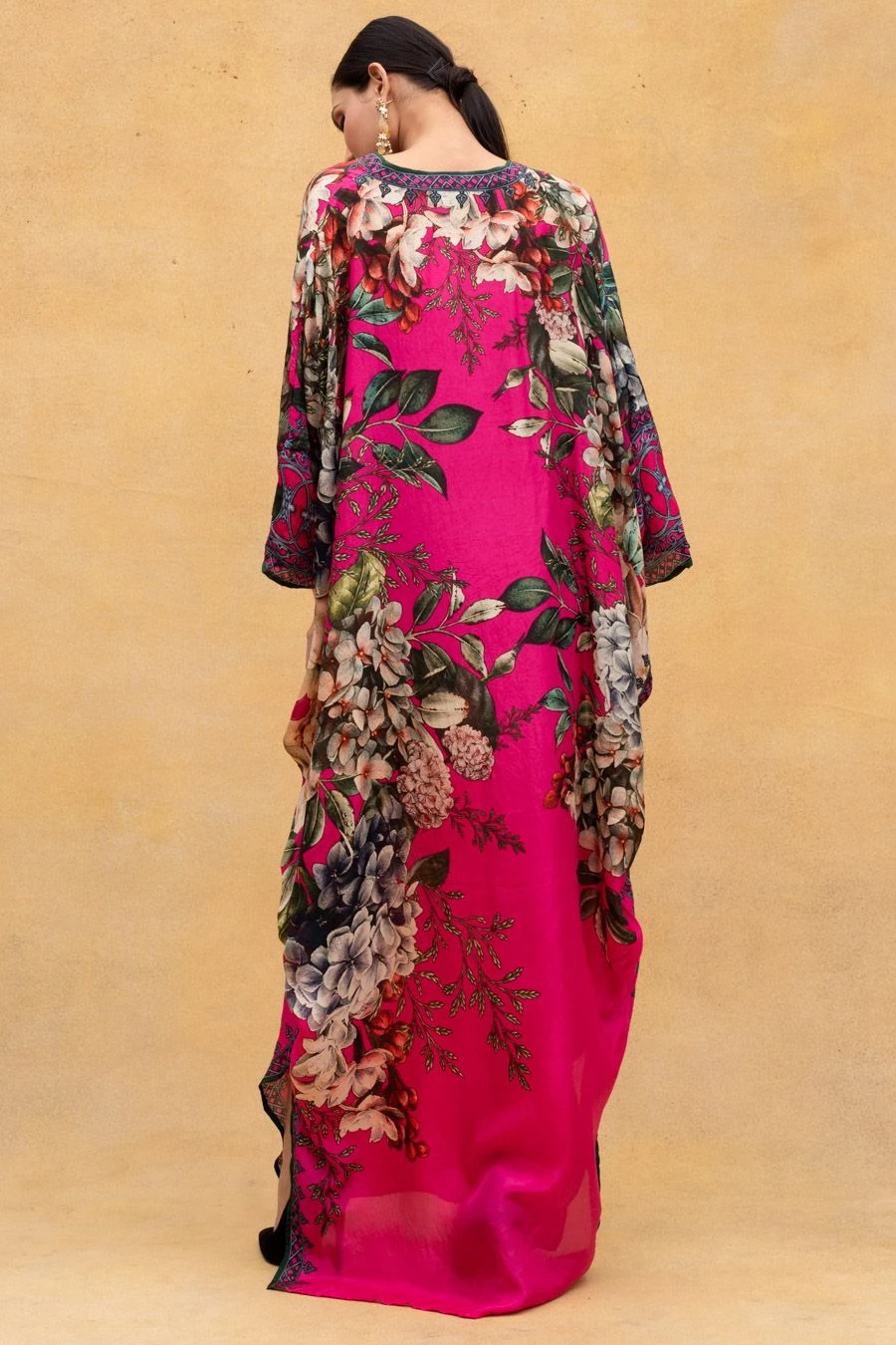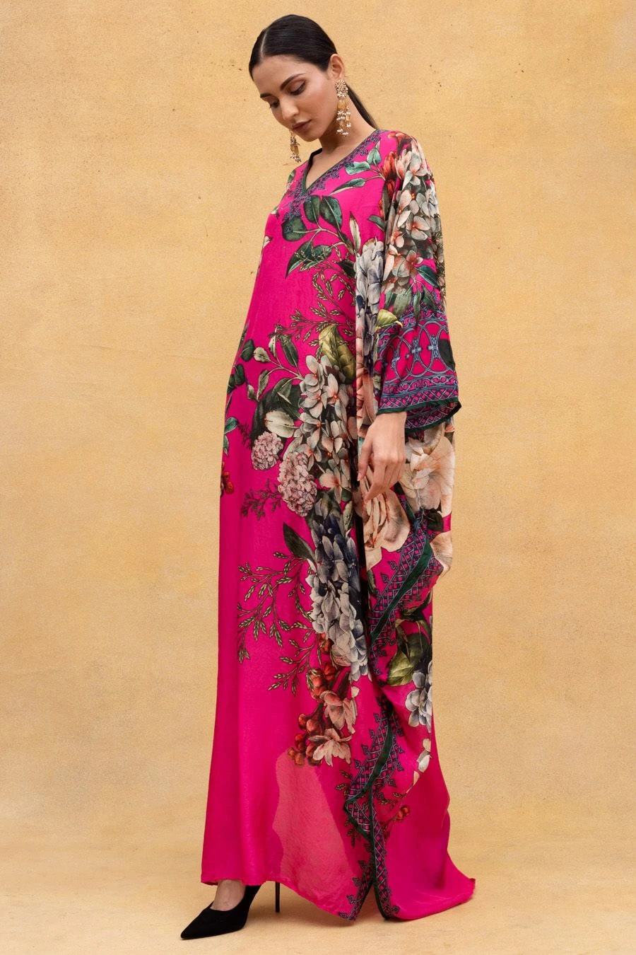 The perfect amalgamation of style and comfort, this kaftan works across occasions. This floral printed silk kaftan with a V-neckline and a narrow bottom hem comes with low side slits.