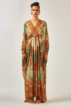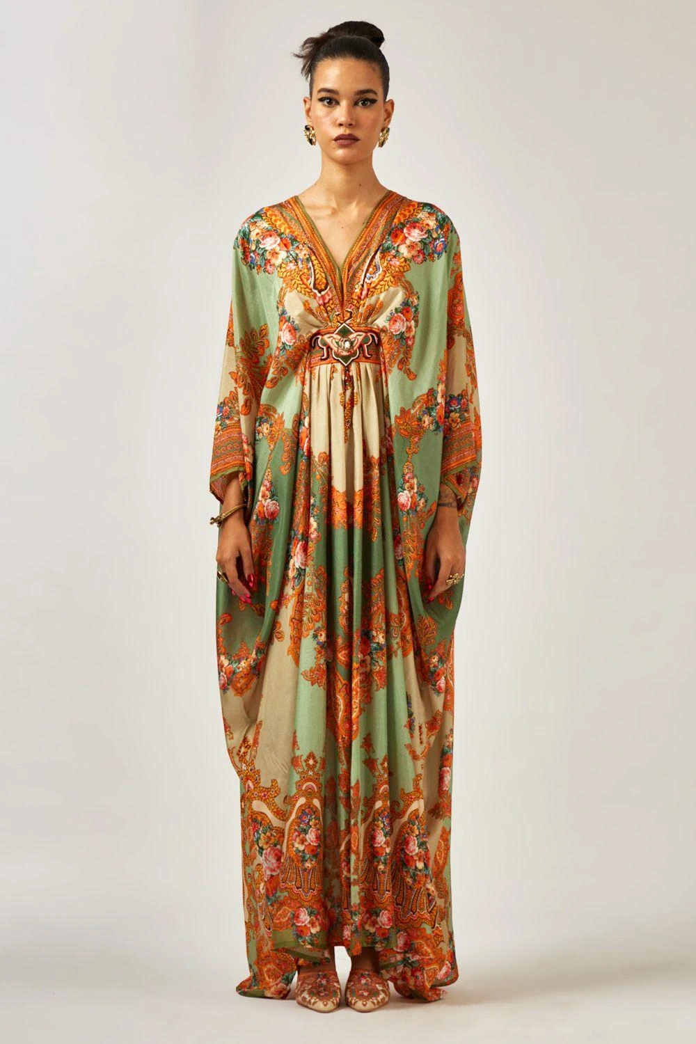 Indulge in opulence with the Long Green V-Neck Waist Jewel Embellished & Printed Kaftan. Adorned with exquisite jewels, this graceful garment embodies sophistication. Enchant with its verdant hues and captivating print.