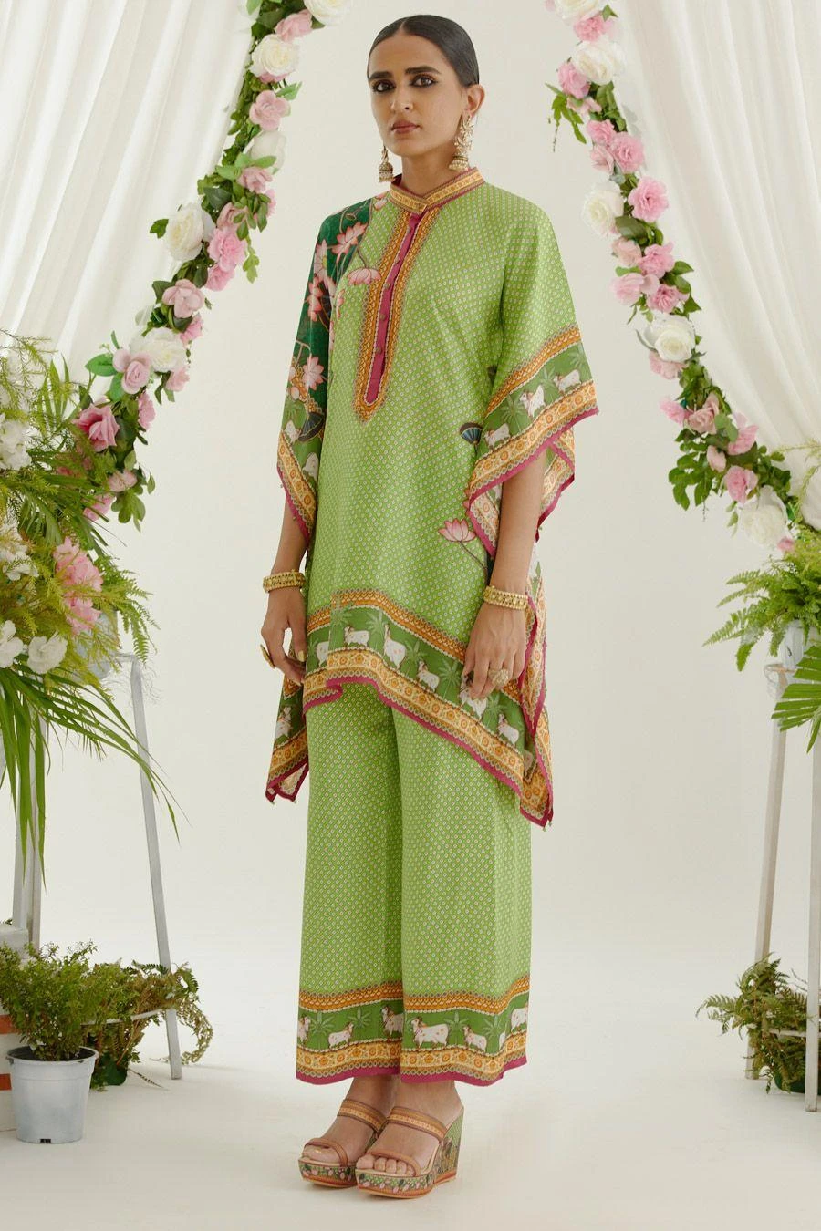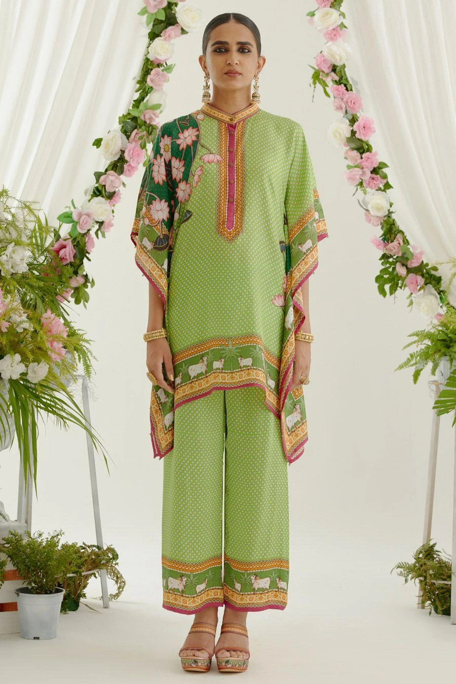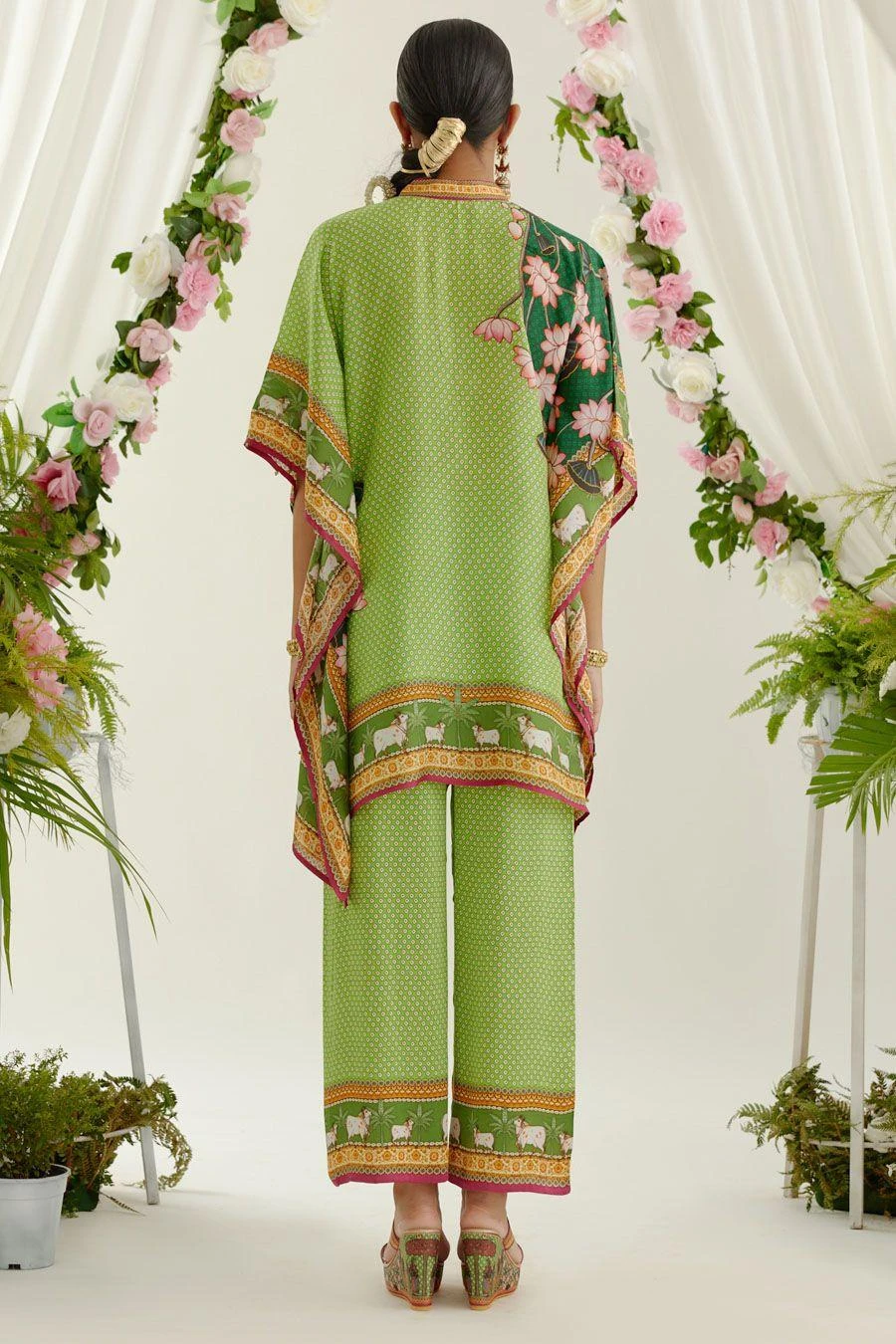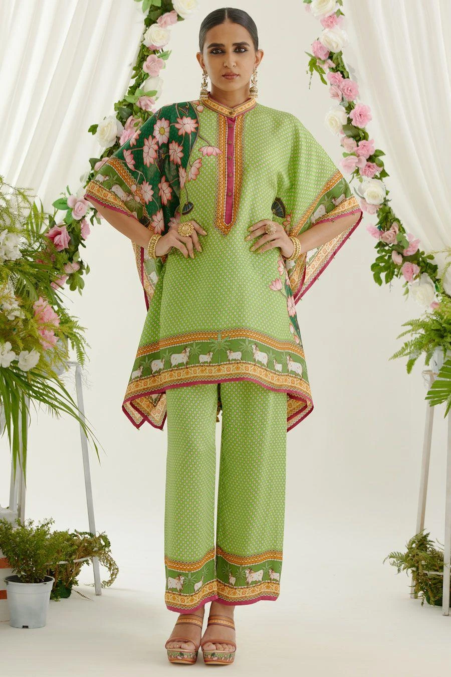 The perfect amalgamation of style & comfort, this set works across occasions. Crafted in silk, this set features a square poncho with a band collar & floral motifs & coordinating pants. Style them with a pair of dangler earrings to complete the look.