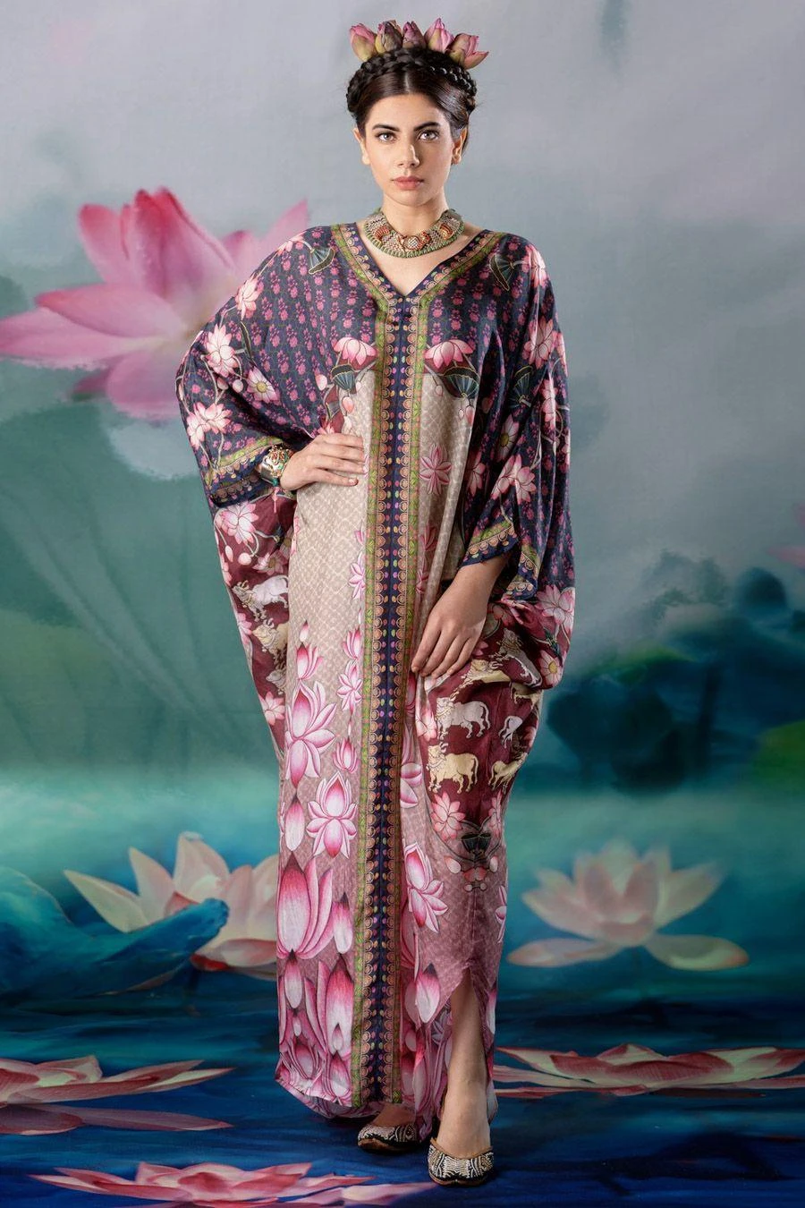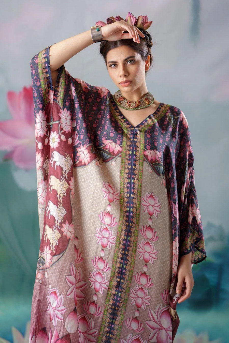 The perfect amalgamation of style & comfort, this kaftan works across occasions. Crafted in silk, this V-neck kaftan features floral printed details with a side slit. Style it with coordinating pants from the collection to complete the set.