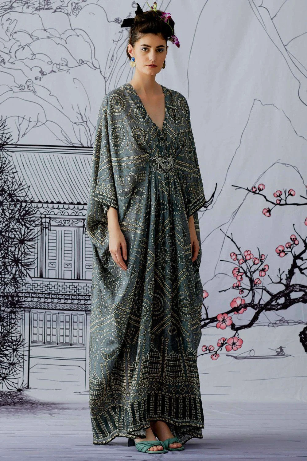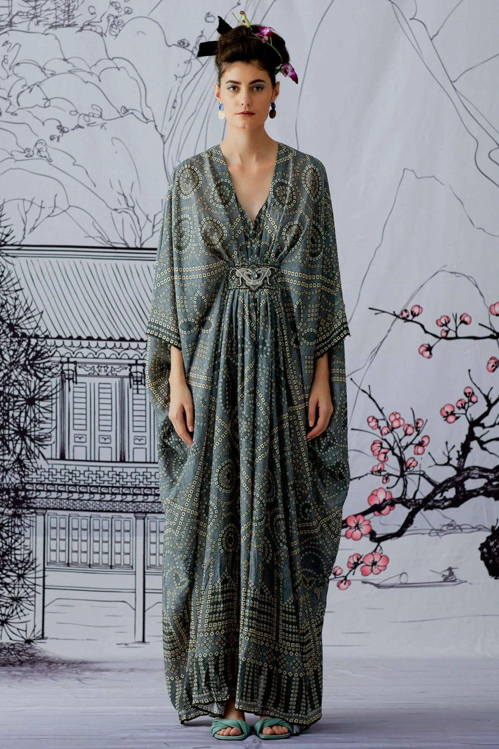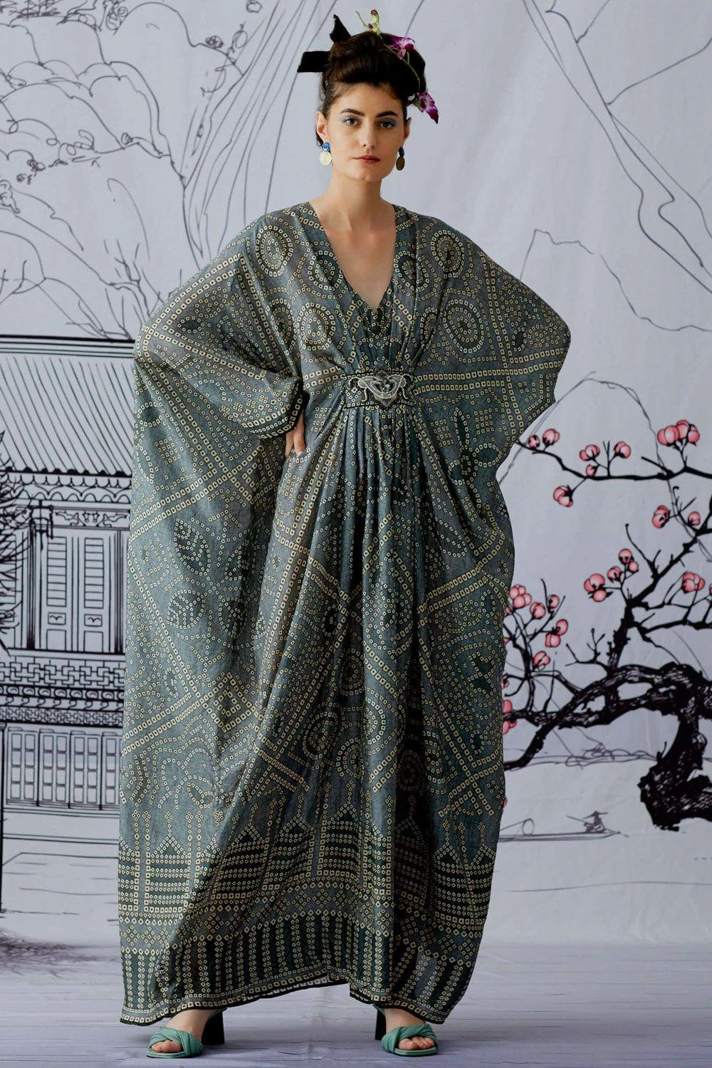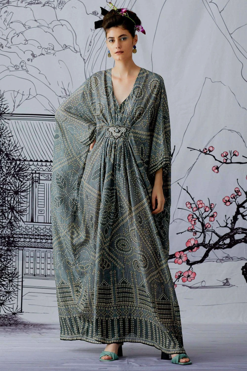 This long V neck waist jewelled printed belt kaftan is perfect for casual festive occasions. This one of a kind piece can be styled with statement studs for a chic daytime look.
