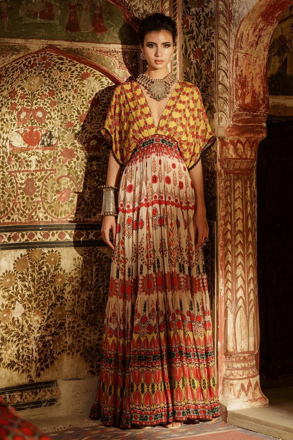 This bohemian tiered kaftan dress is printed with multiple suzani motifs engineered beautifully in each tier of the dress with a draped bodice embellished with intricate mirror work.