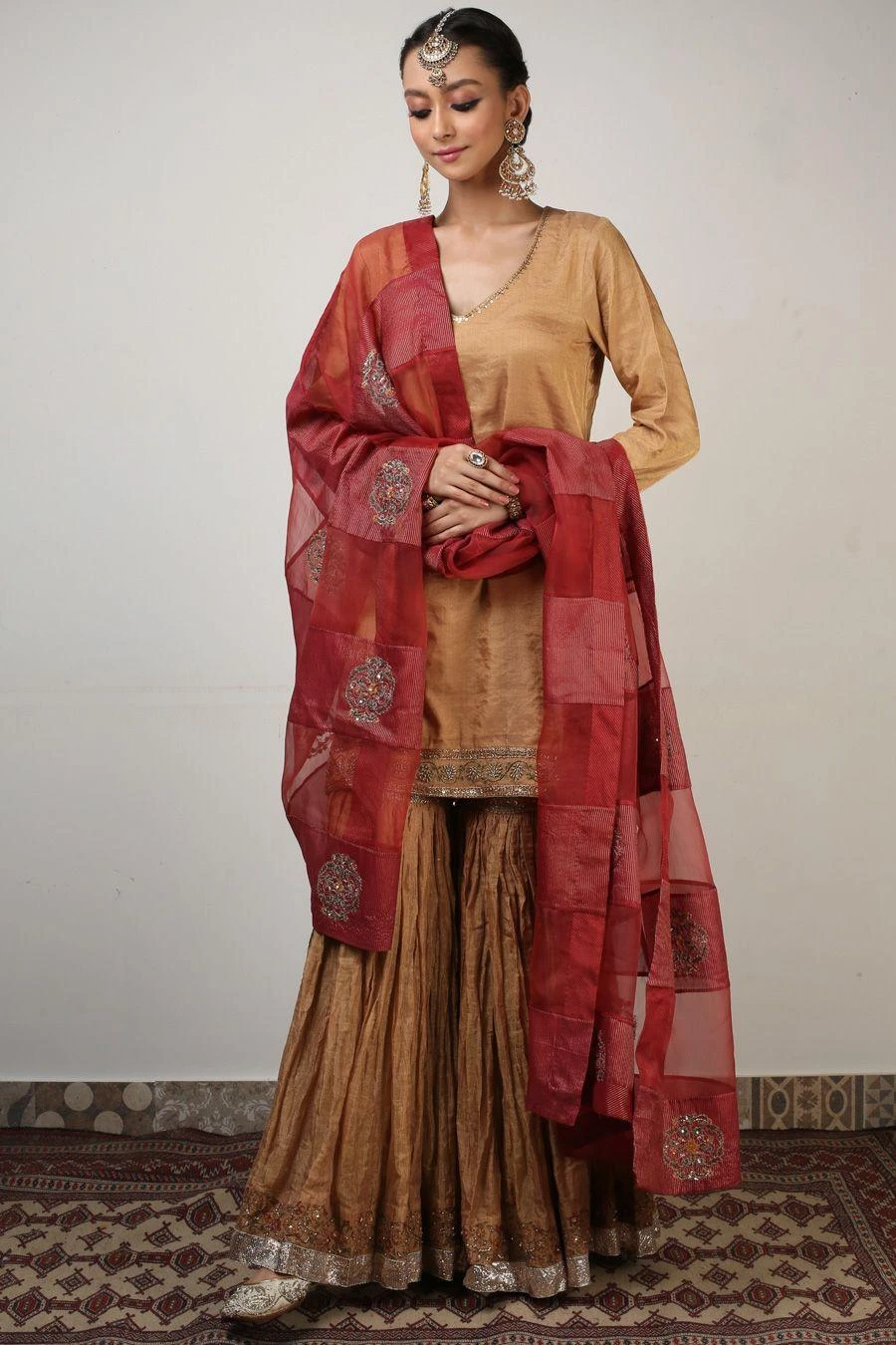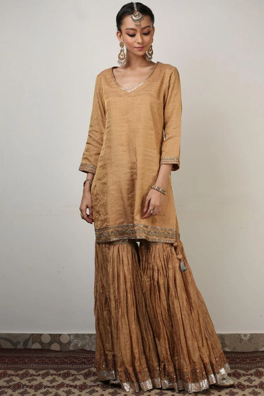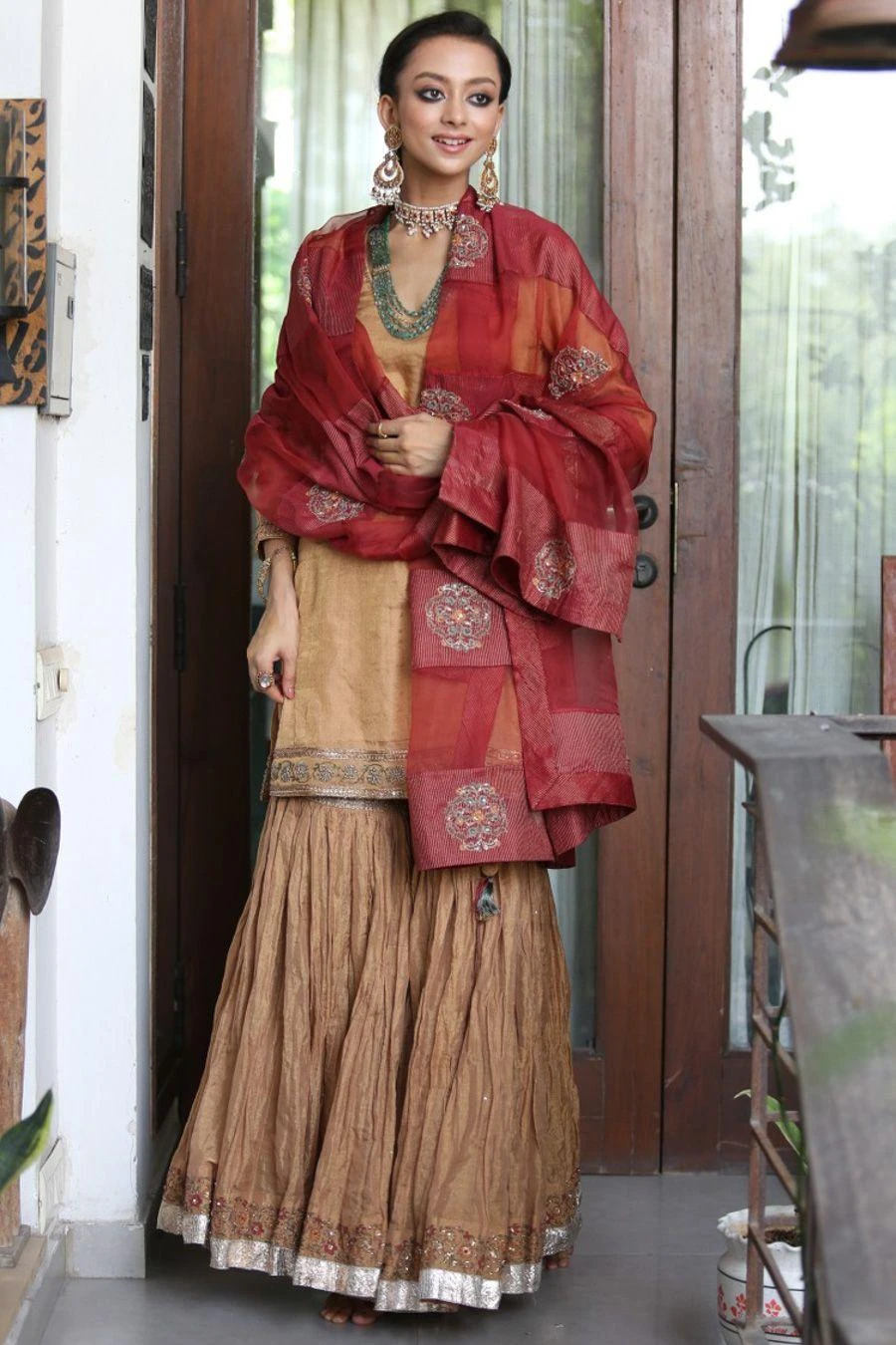 This sharara set will see you through all kinds of celebrations this festive season. Crafted in aari & zardosi embroidery, this set comes with a Banarsi tissue silk kurta and sharara paired with a stripe chanderi & organza panelled dupatta.