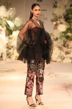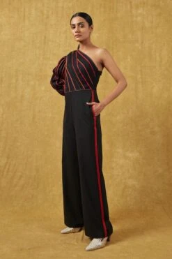 If you’re looking for a head-turning statement-making jumpsuit this is the outfit for you. Crafted in bamberg silk, this ivory jumpsuit comes with an organza panel and a corset belt.