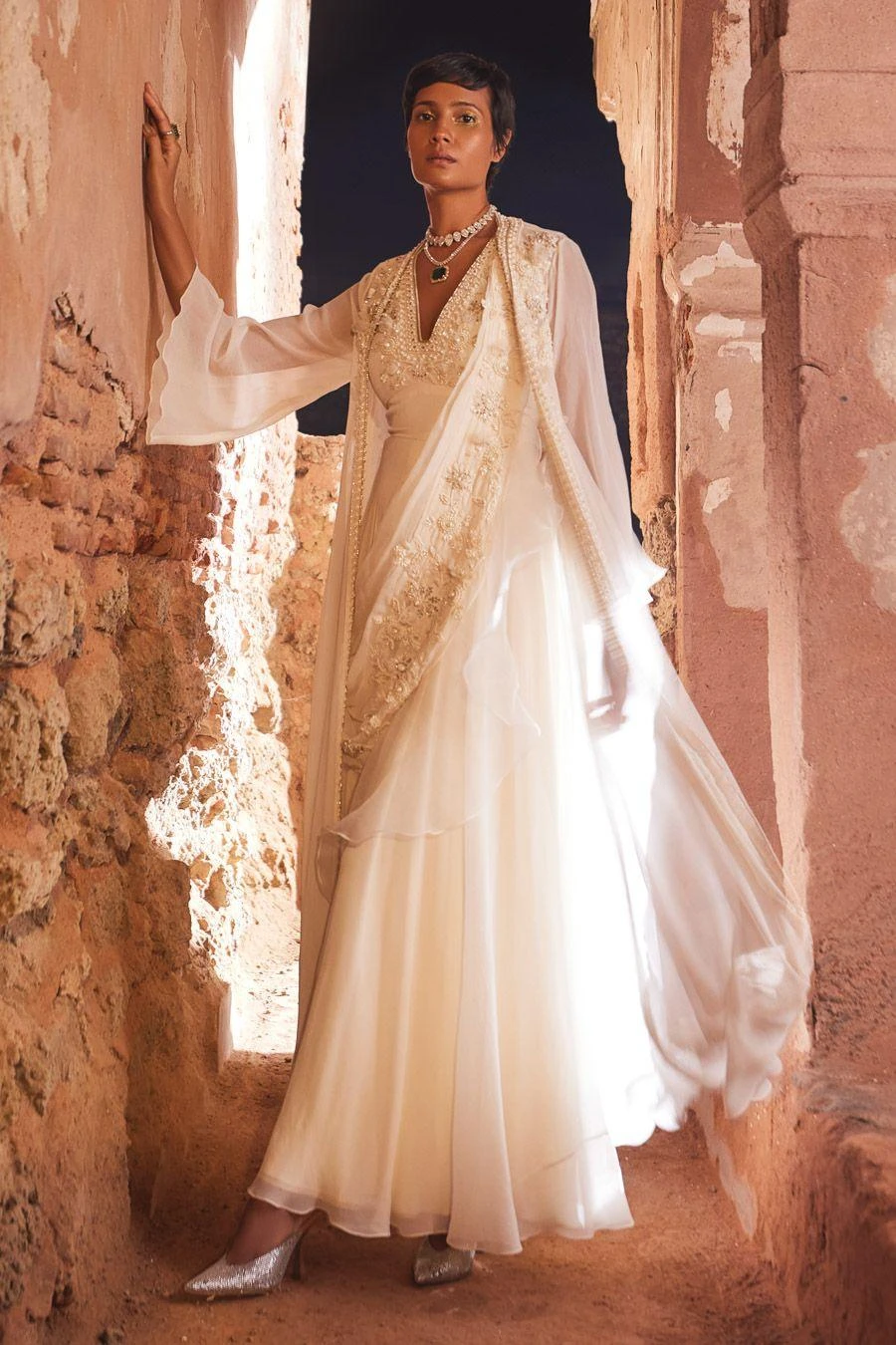 Material/Fabric : Jumpsuit : Chiffon, Jacket : Chiffon, Drape : Chiffon/ organza