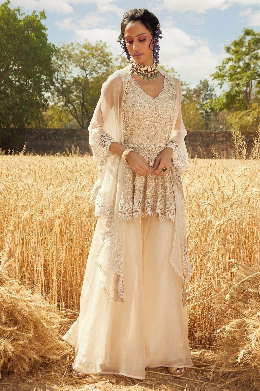 Embrace a dreamy look in this ivory organza sharara set. Set in sheer organza, it features a pearl embroidered layered peplum kurta paired with an embroidered cape & pants. You can adorn emerald jewellery with this look.