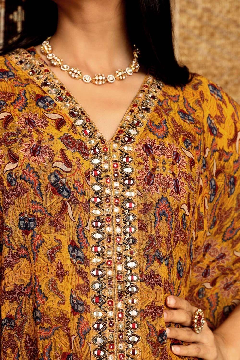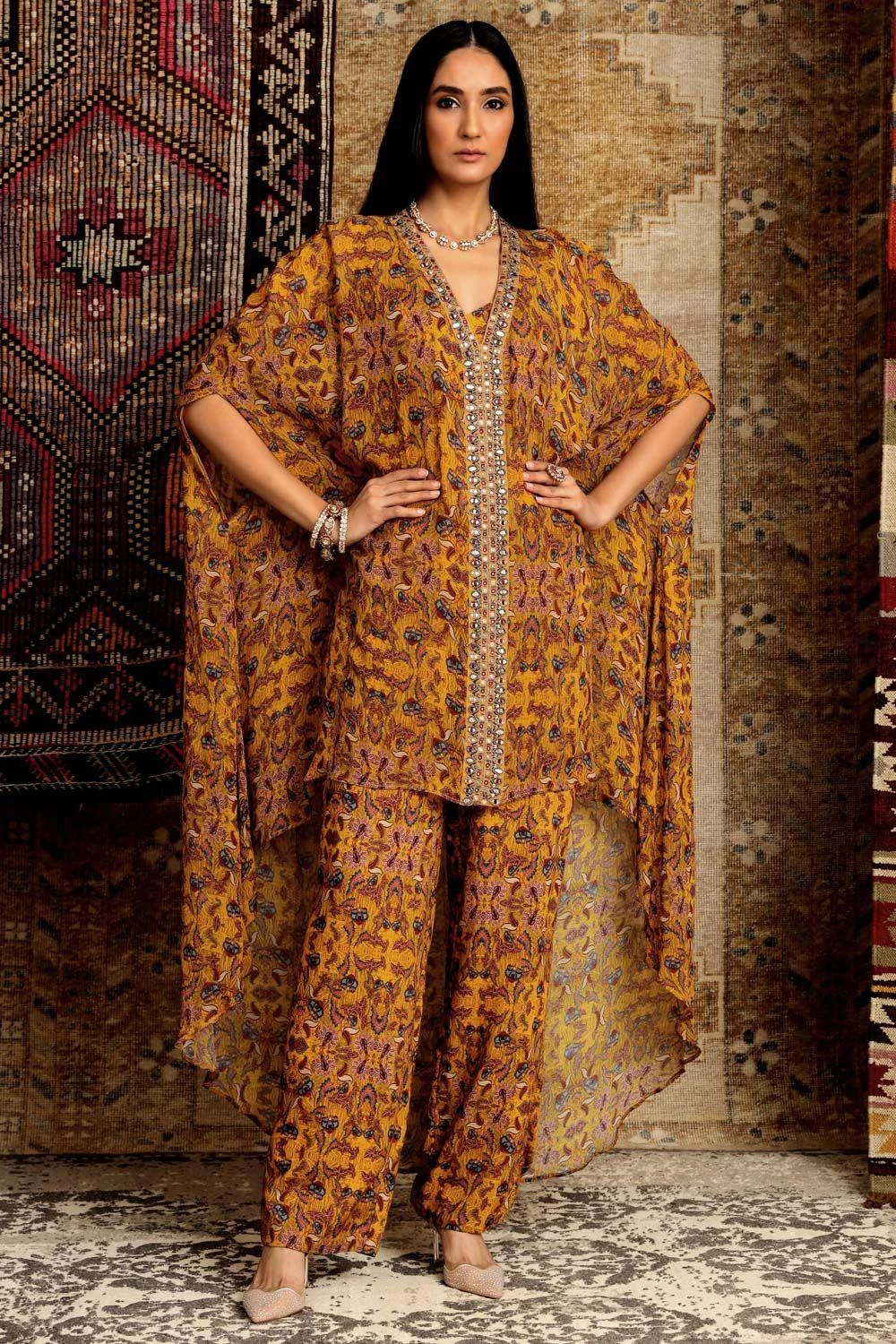 The upcoming balmy season calls for light & minimal clothing for your festive days. This printed set features a georgette base high-low kaftan, paired with matching pants and a bustier. You can elevate your look with a pair of statement earrings.