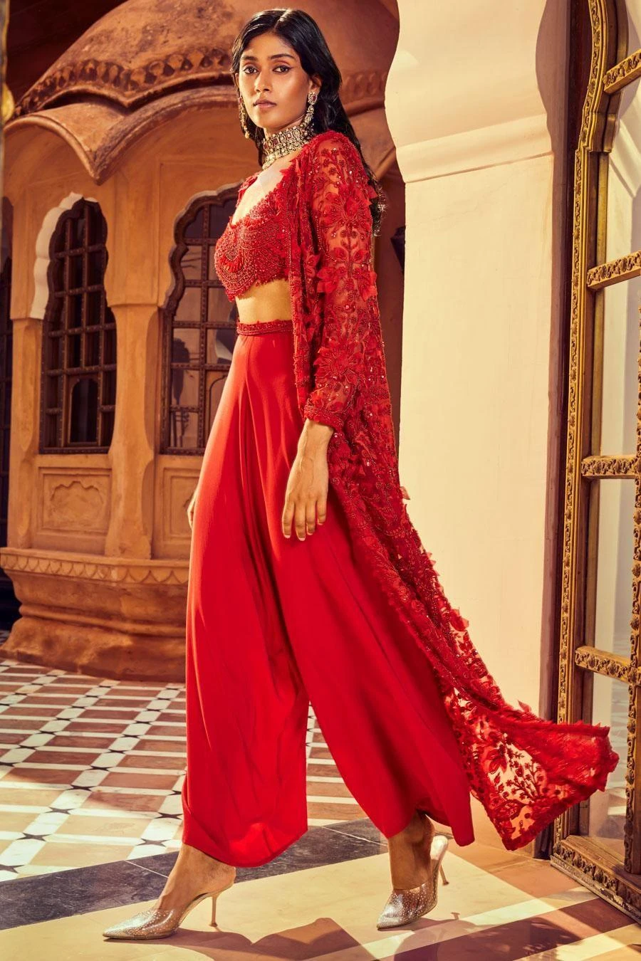 This red jacket set is a must-have pre-wedding ensemble you need to stock up on. Crafted in organza, this set features a 3-D embellished jacket with a pearl drop scallop bustier & cowl pants. Add a pair of statement earrings to complete the look.