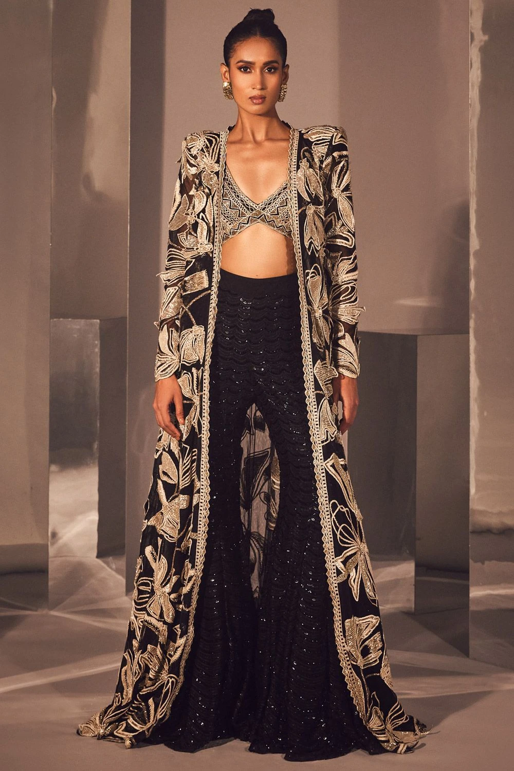 Indulge in the epitome of elegance with this abstract blouse. Paired with a flared wave sharara and abstract floral jacket. The abstract patterns and floral motifs exude artistic charm, while the flared sharara and long jacket add a touch of grace.