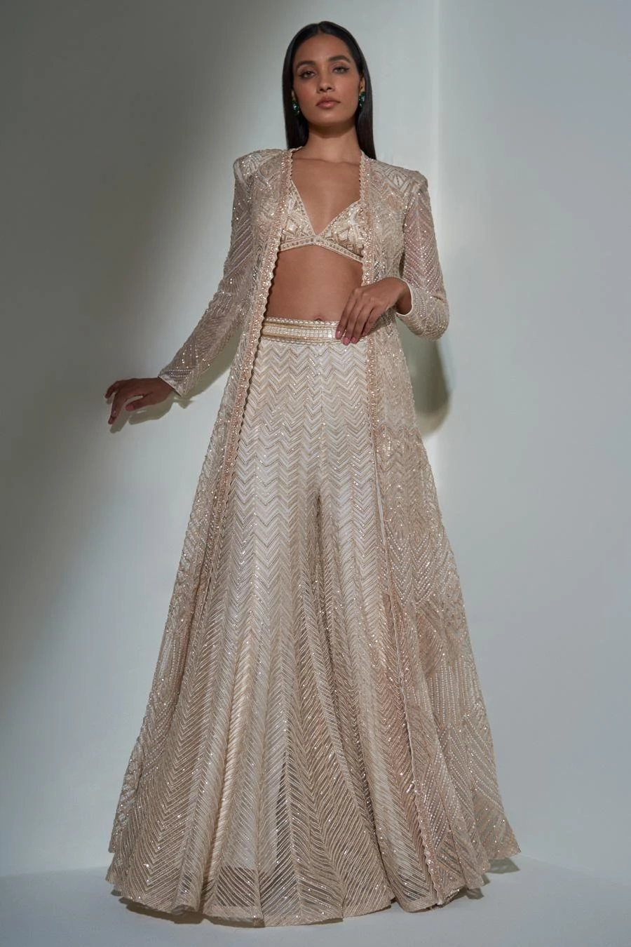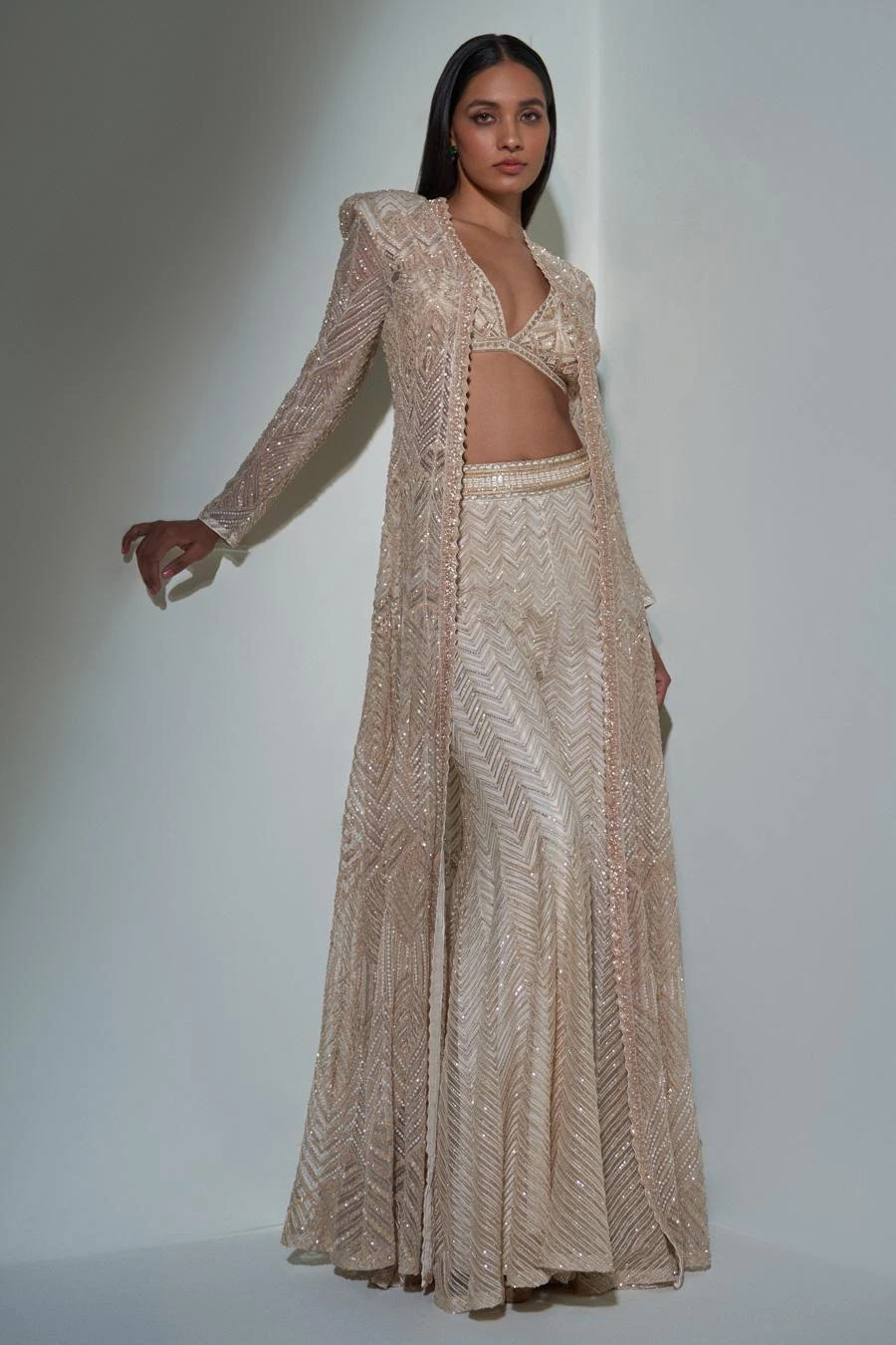 With its contemporary embroidery details and gold & black hues, this jacket set is a must-have during the festive season. It features a net based gold hand embroidered jacket, paired with a bustier, sharara pants.