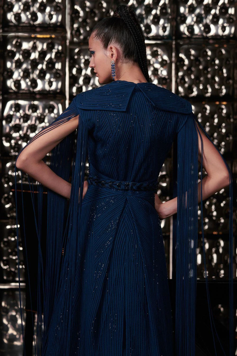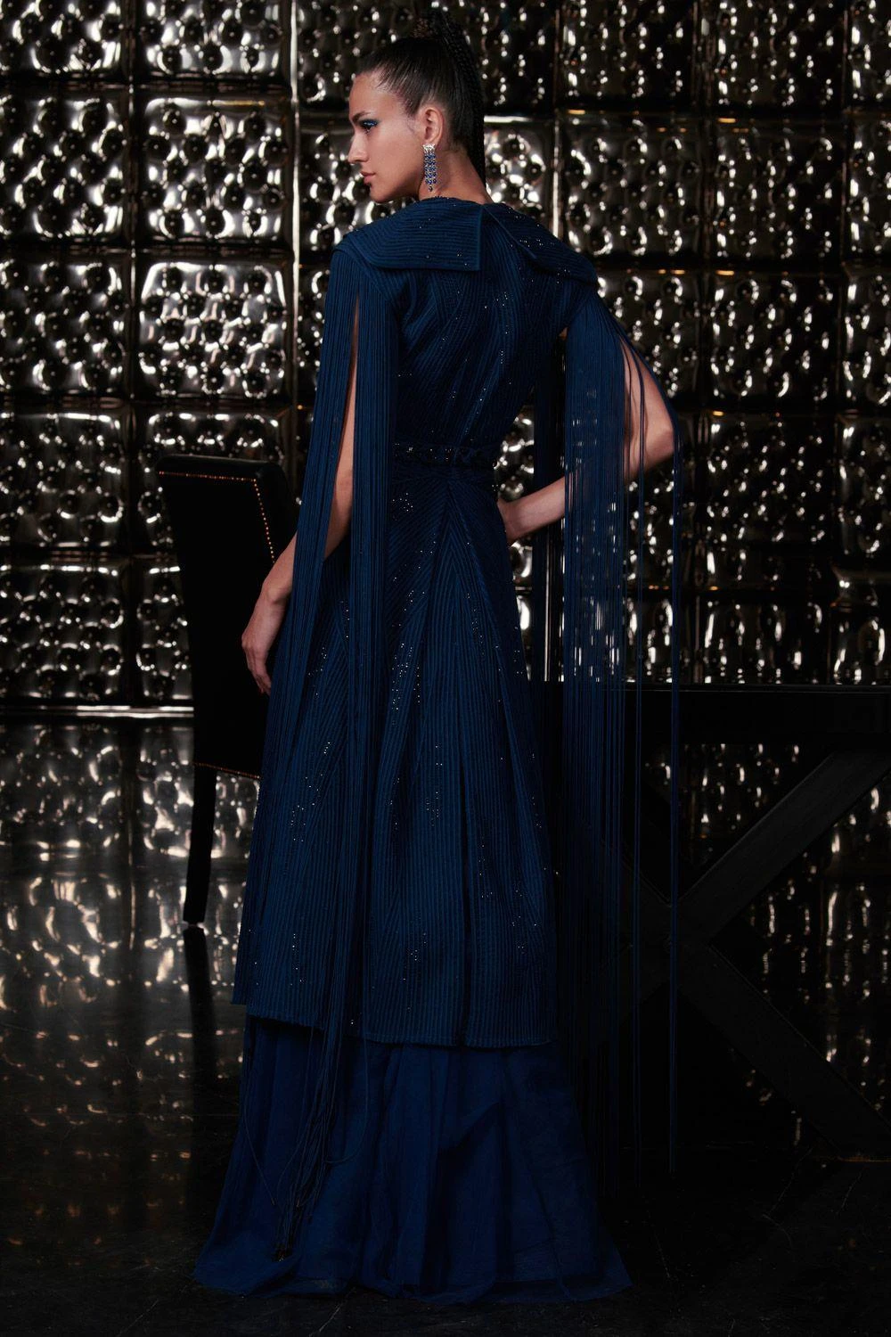 This galaxy blue jacket set is meant to turn heads. It features a matrix constructed dori jacket paired with an ethereal tulle gown. This sophisticated look can be elevated with a pair of statement earrings.