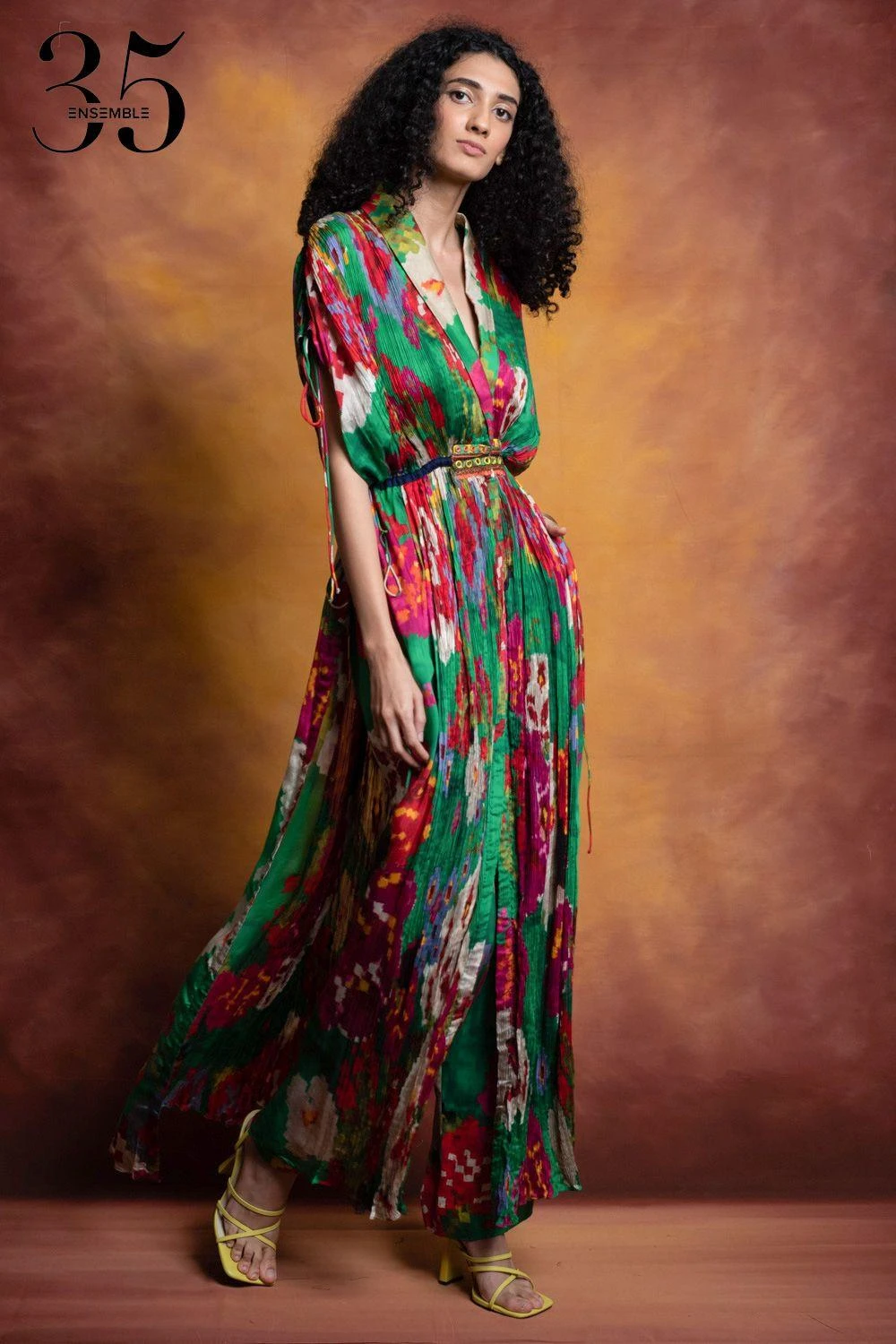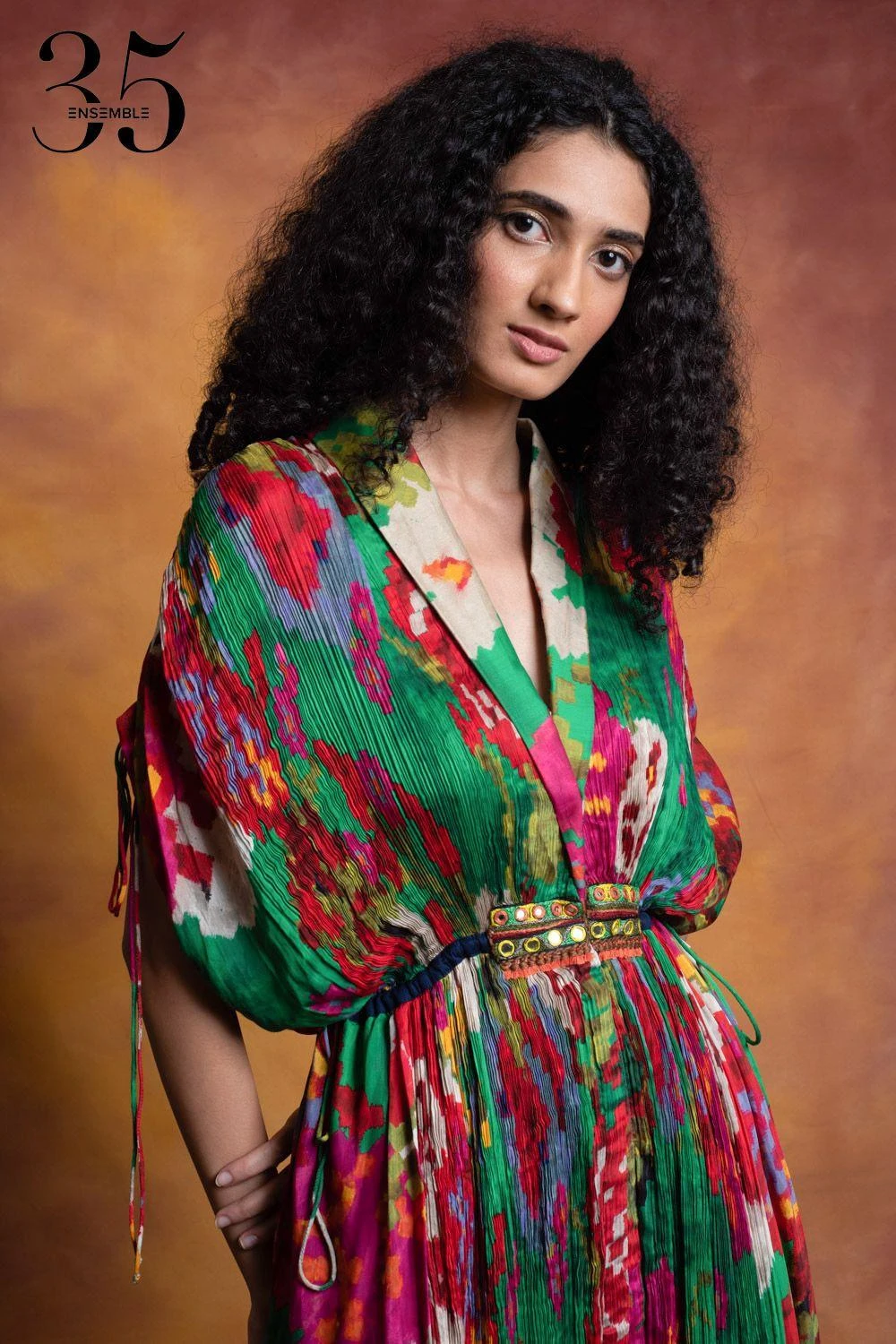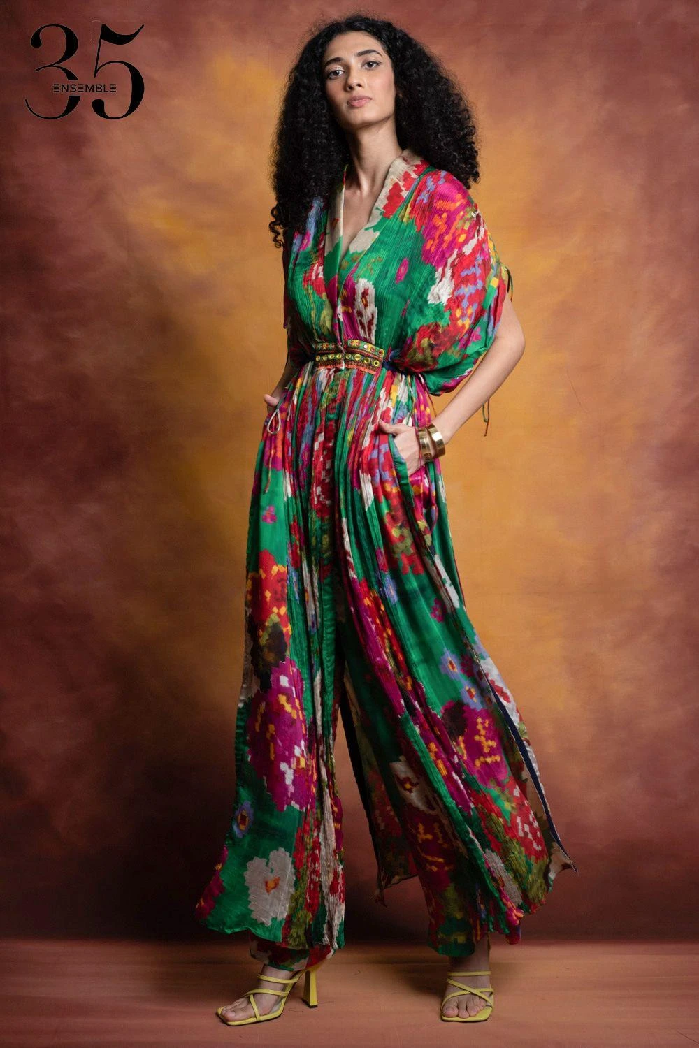 A yearlong celebration of its 35th anniversary telling the story of modern Indian fashion. Add a layer of glamour & statement style to your resort getaways with this kaftan. It features a floral print with a lapel collar & an embellished waist.
