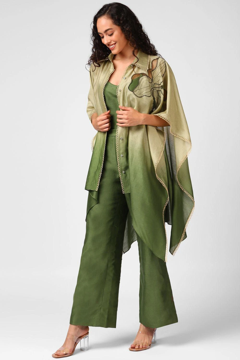 From lounging at home to catching flights, you can always count on this cape set. Cut in chanderi silk, this set features a one side applique embroidered cape, paired with a slip and sraight pants