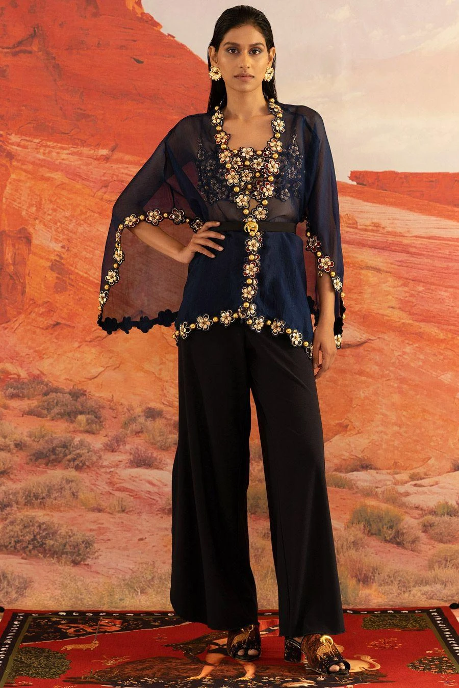 The sapphire peri golden skein cape is a striking style rendered in silk organza & intricately edged in handcrafted skeinwork. Draped to fall gently over the frame, the cape can be styled with a myriad of resort wear and celebration wear styles.