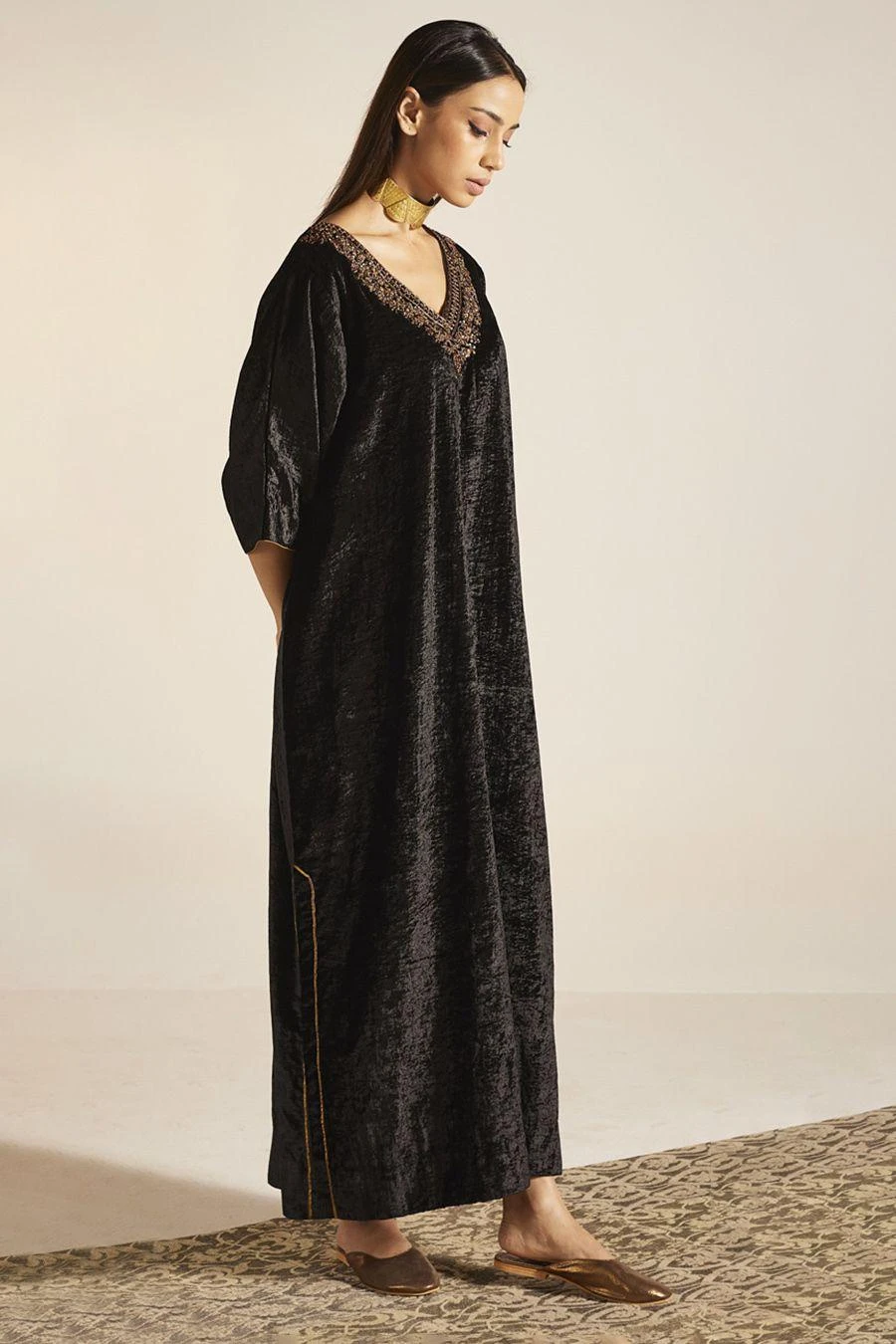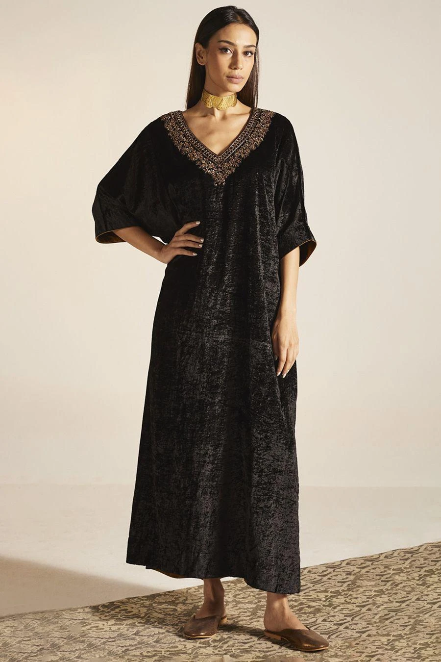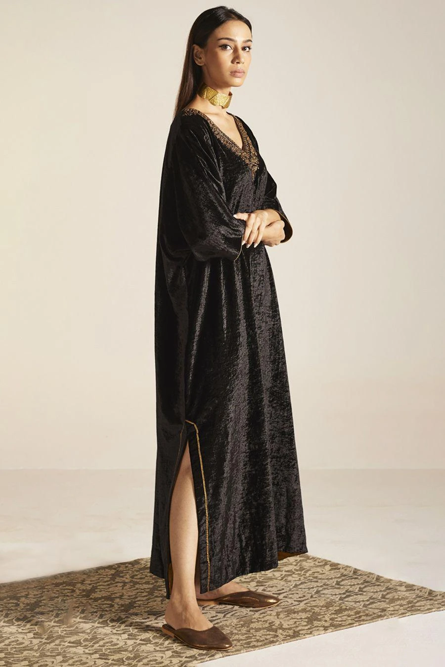 The perfect amalgamation of style and comfort, this kaftan is perfect for pre wedding festivities. Crafted in silk velvet, this kaftan features a hand embroidered neckline. Add a pair of statement earrings to complete the look.