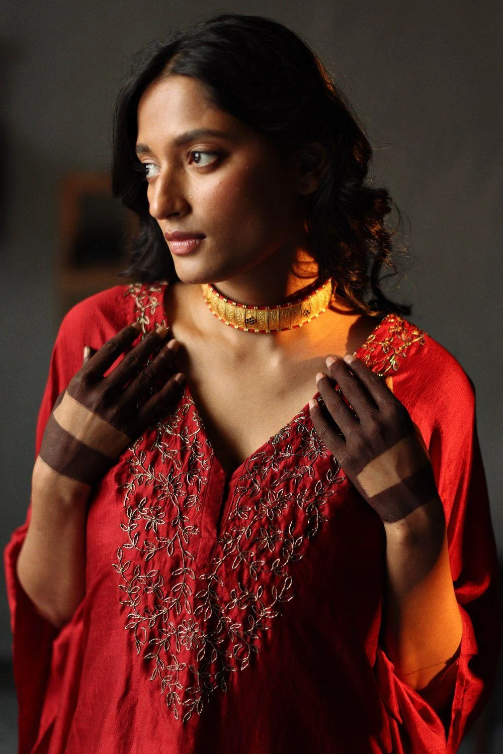 This minimally embellished kaftan set will see you through all kinds of festivities. This set features a hand embroidered mulberry silk kaftan. Style it with a pair of statement earrings to complete the look.