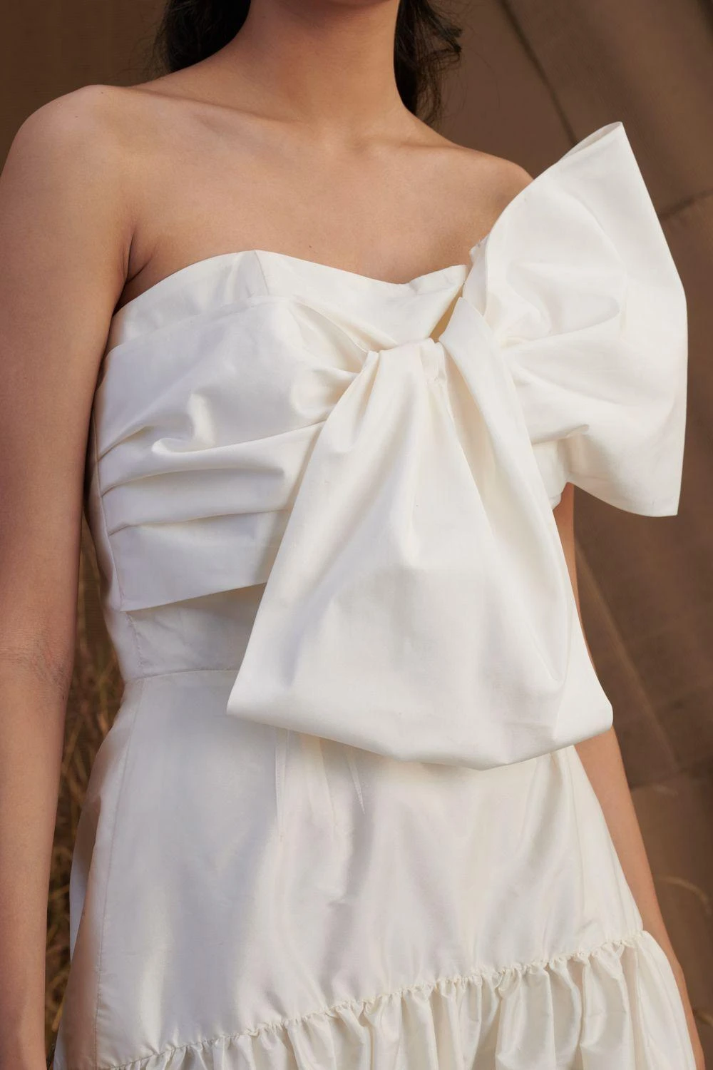 This subtle & stunning taffeta tiered gown comes with a dramatic bow detail. This piece is perfect for a wedding event & can be styled with a delicate diamond necklace to complete the look.