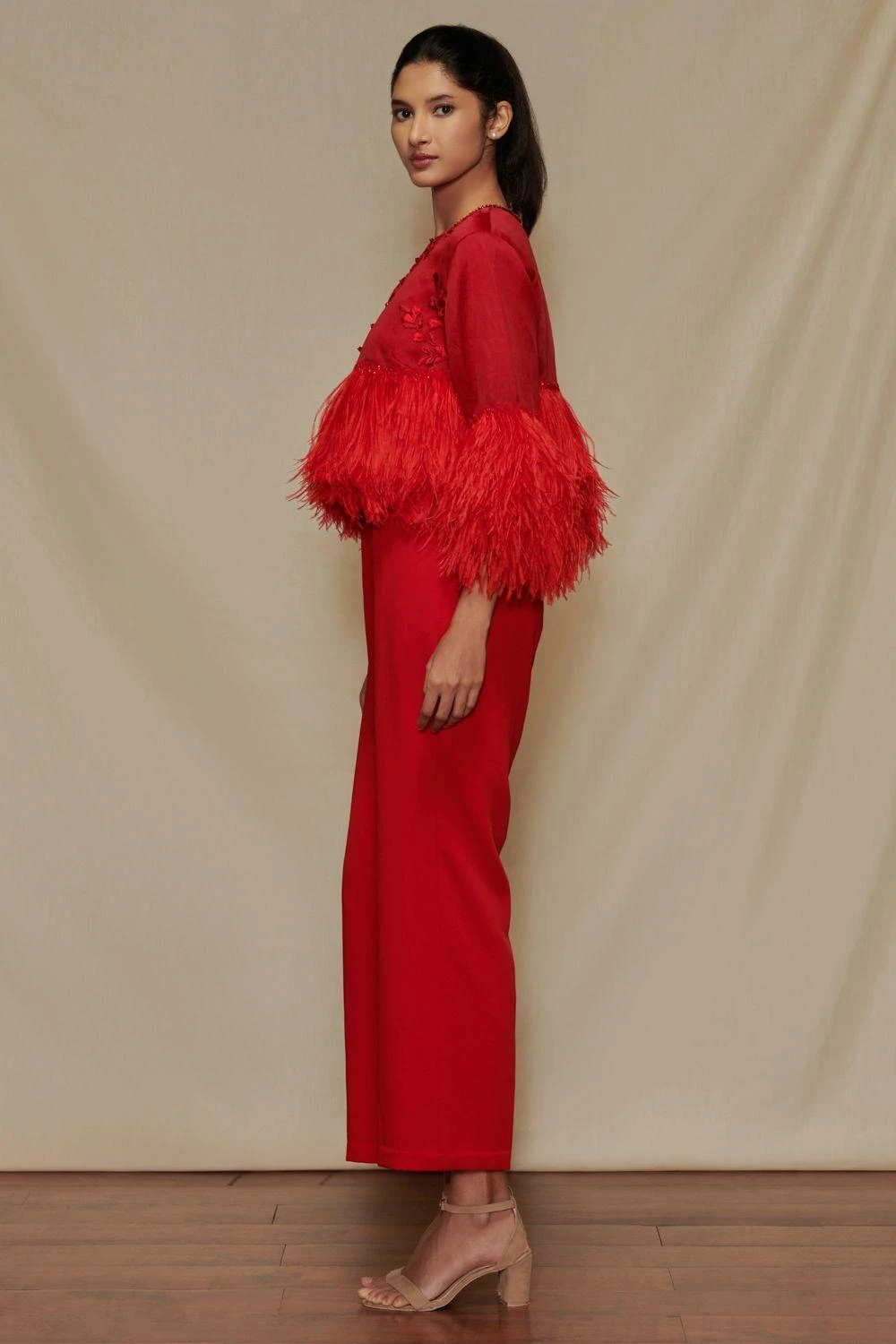 Make a bold & fiery statement at your cocktail evening in this red jumpsuit & capelet. The jumpsuit is made in a plain crepe base, while the capelet is accented with floral embroidery and extravagant feather details.