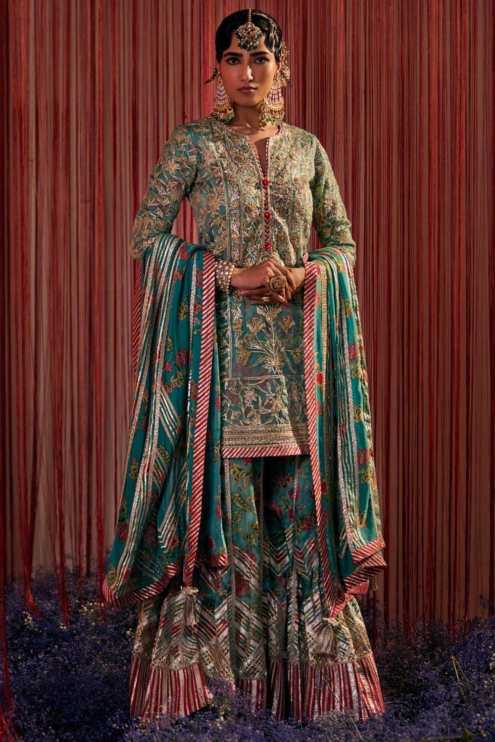This sharara set will see you through all kinds of celebrations this festive season. It comes with a nakshi and gota patti embroidered short kurta & sharara with a heavily embroidered border paired with a georgette dupatta with handmade tassels.