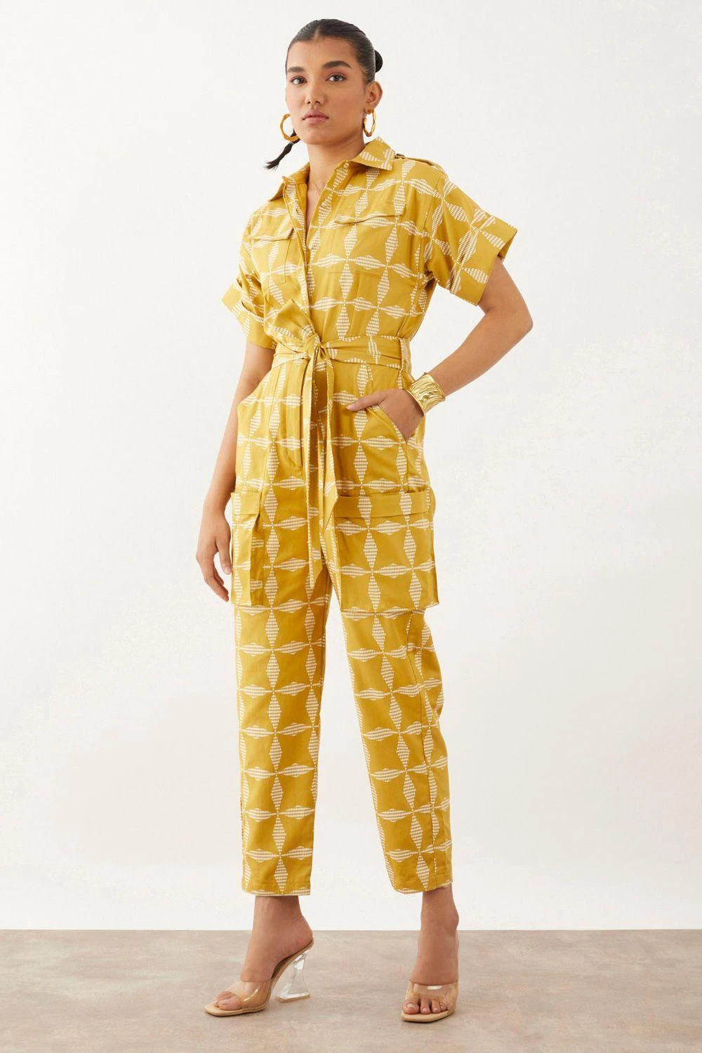 Make a bold statement in this Fan Print Jumpsuit, adorned with intricate multi-pocket detailing. This piece seamlessly blends fashion and functionality for a striking ensemble that stands out with its unique design.