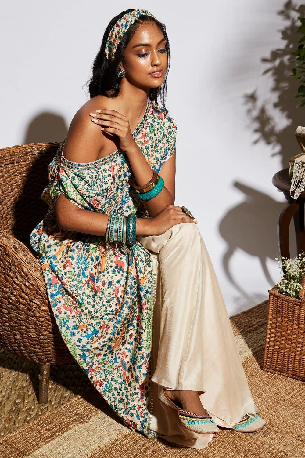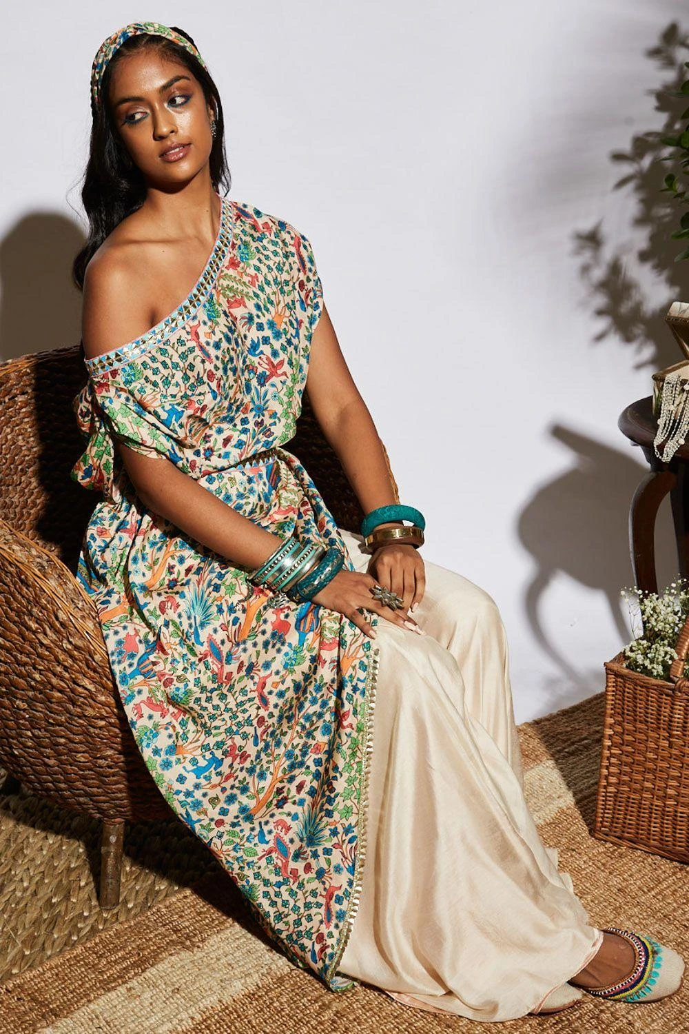 Make a chic style statement in this bagh print sharara set. It features a silk one shoulder drape kaftan tunic paired with beige sharara pants. You can style it with a statement belt for an accentuated look.