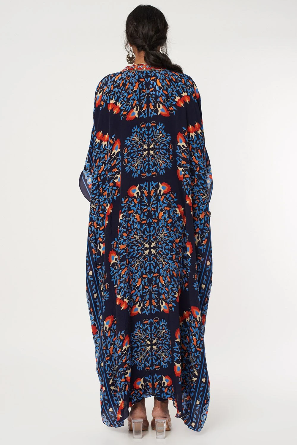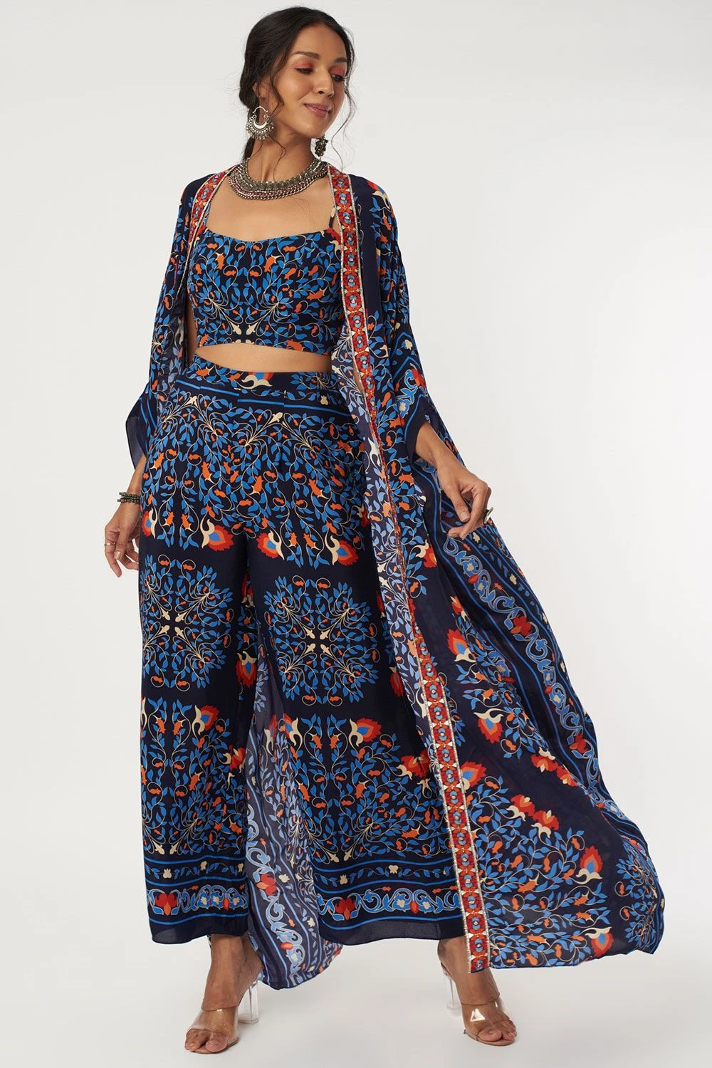 Swap your dupattas for capes this festive season. Crafted in crepe silk, this set features a butta printed cape paired with a strappy bustier and pants. Style this set with a pair of statement earrings & a clutch to complete the look.