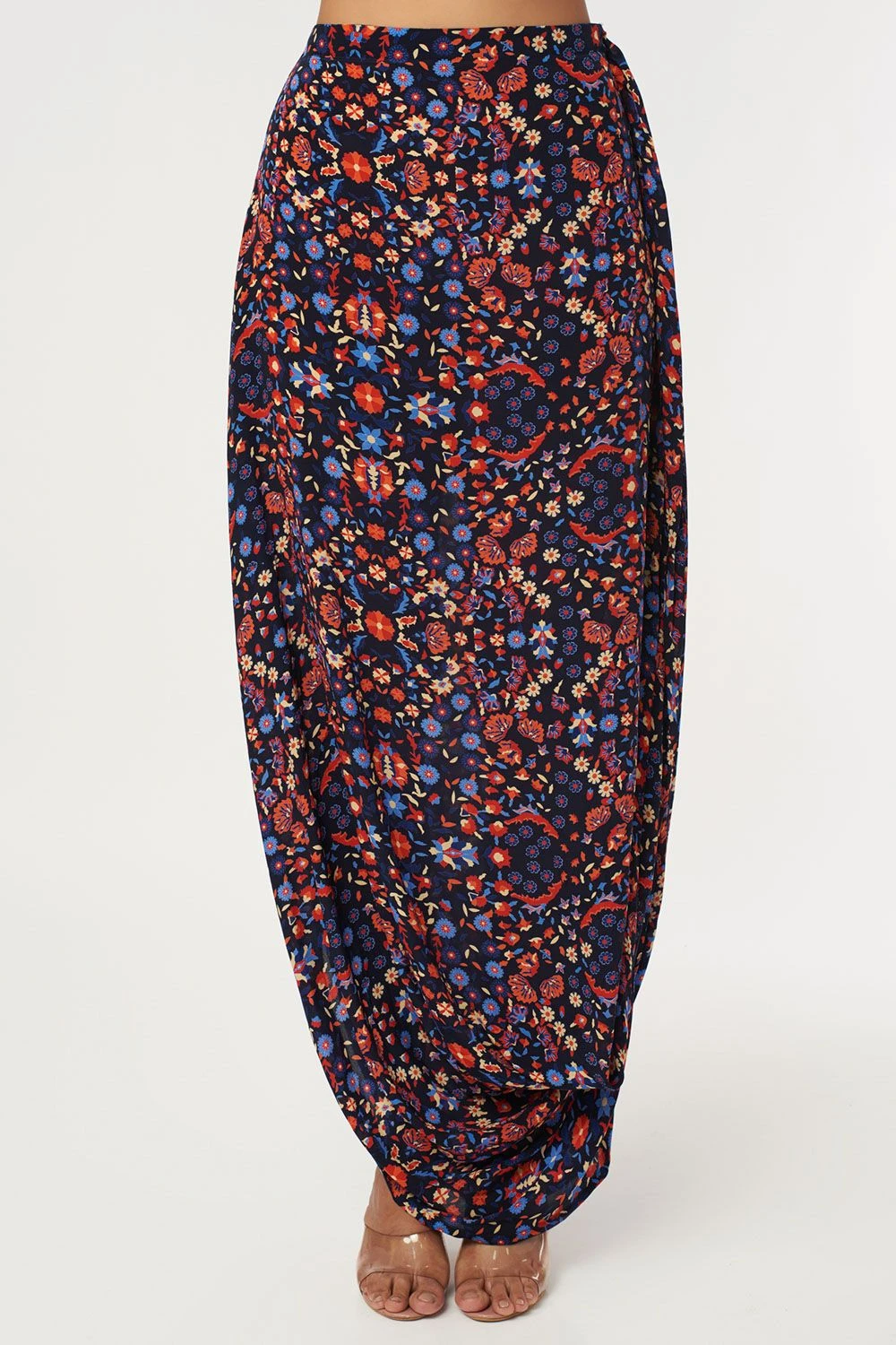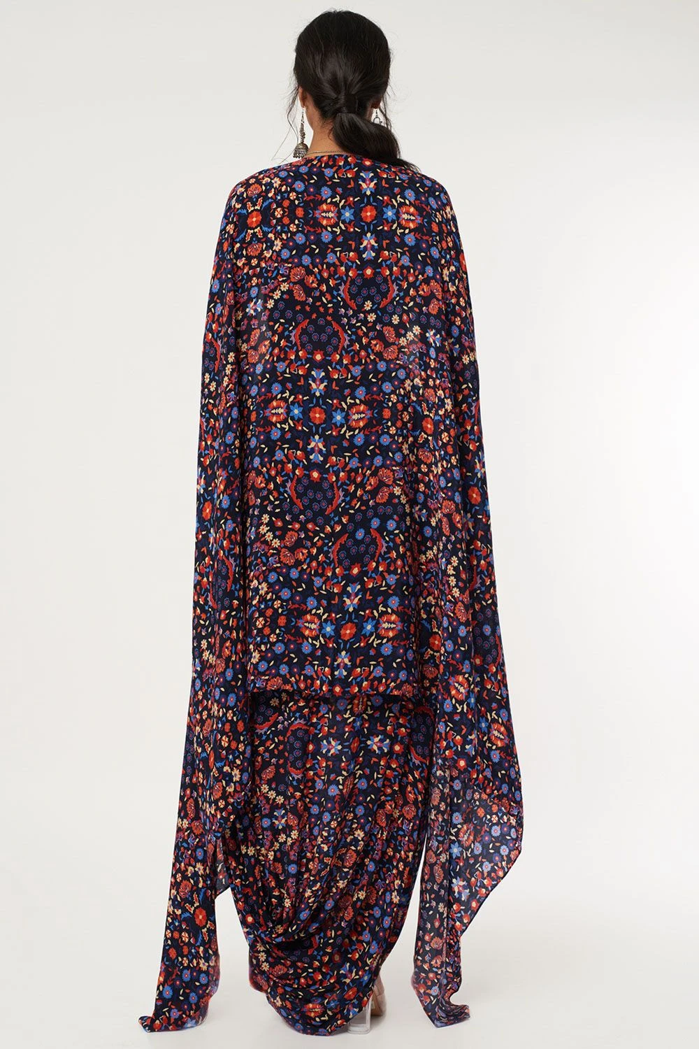 Swap your dupattas for capes this festive season. Crafted in crepe silk, this set features a jaal printed cape paired with a draped skirt and a bustier. Style this set with a pair of statement earrings & a clutch to complete the look.
