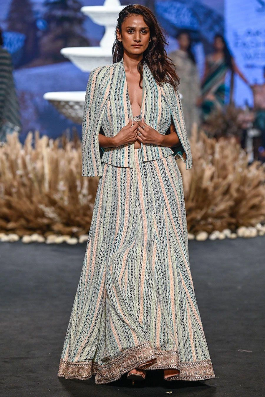 SVA’s runway collection evokes picturesque imagery with vibrant prints infused with Indo-Western fusion silhouettes. Crafted in silk, this set features a striped lucknowi lehenga with a patchwork corset & a cape style jacket.