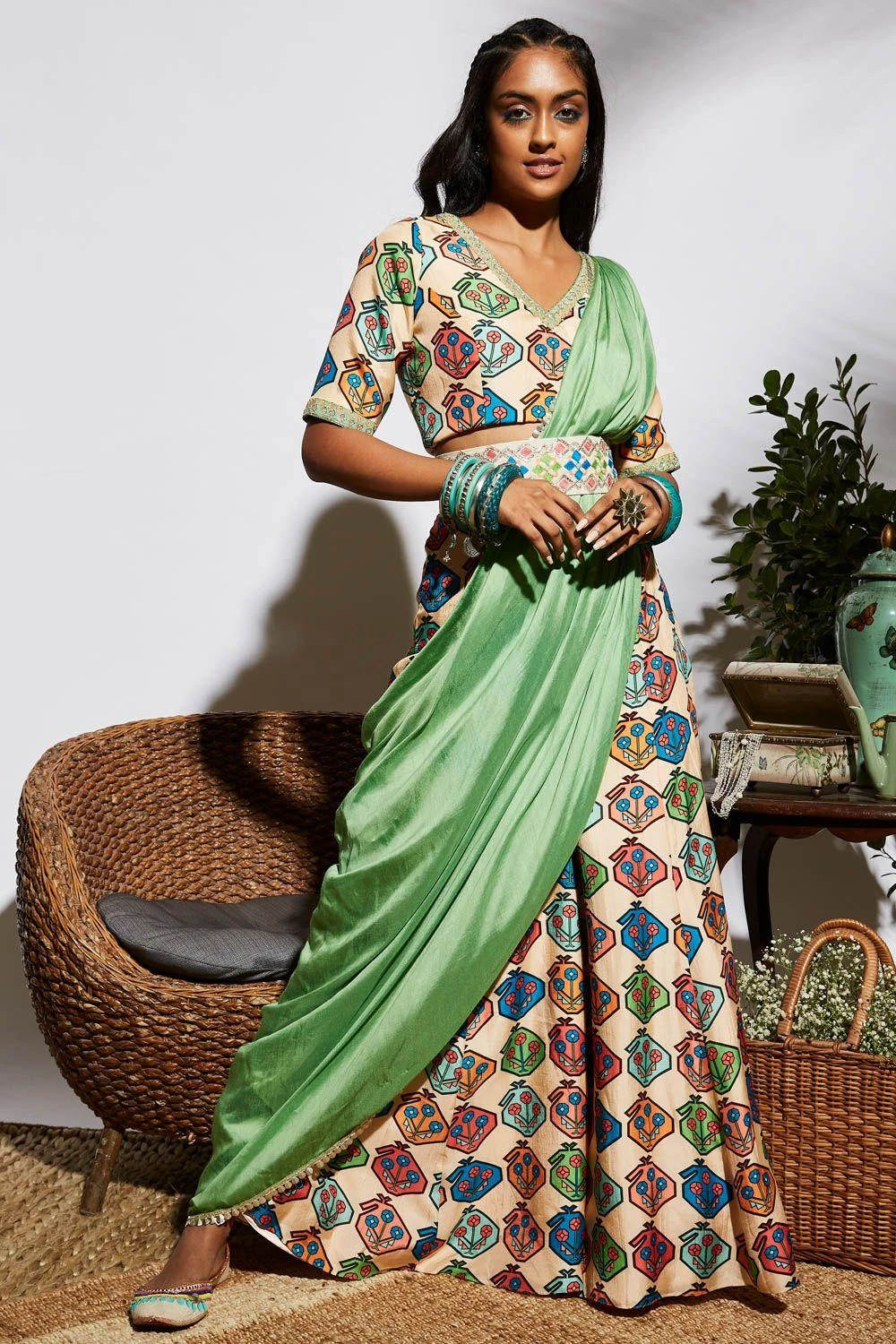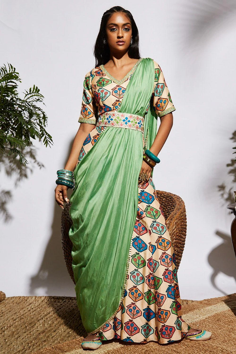 Brighten up your festive closet with this printed sharara sari set. It features a pair of printed silk sharara pants paired with a matching blouse and a green drape. It comes with an embroidered broad belt.