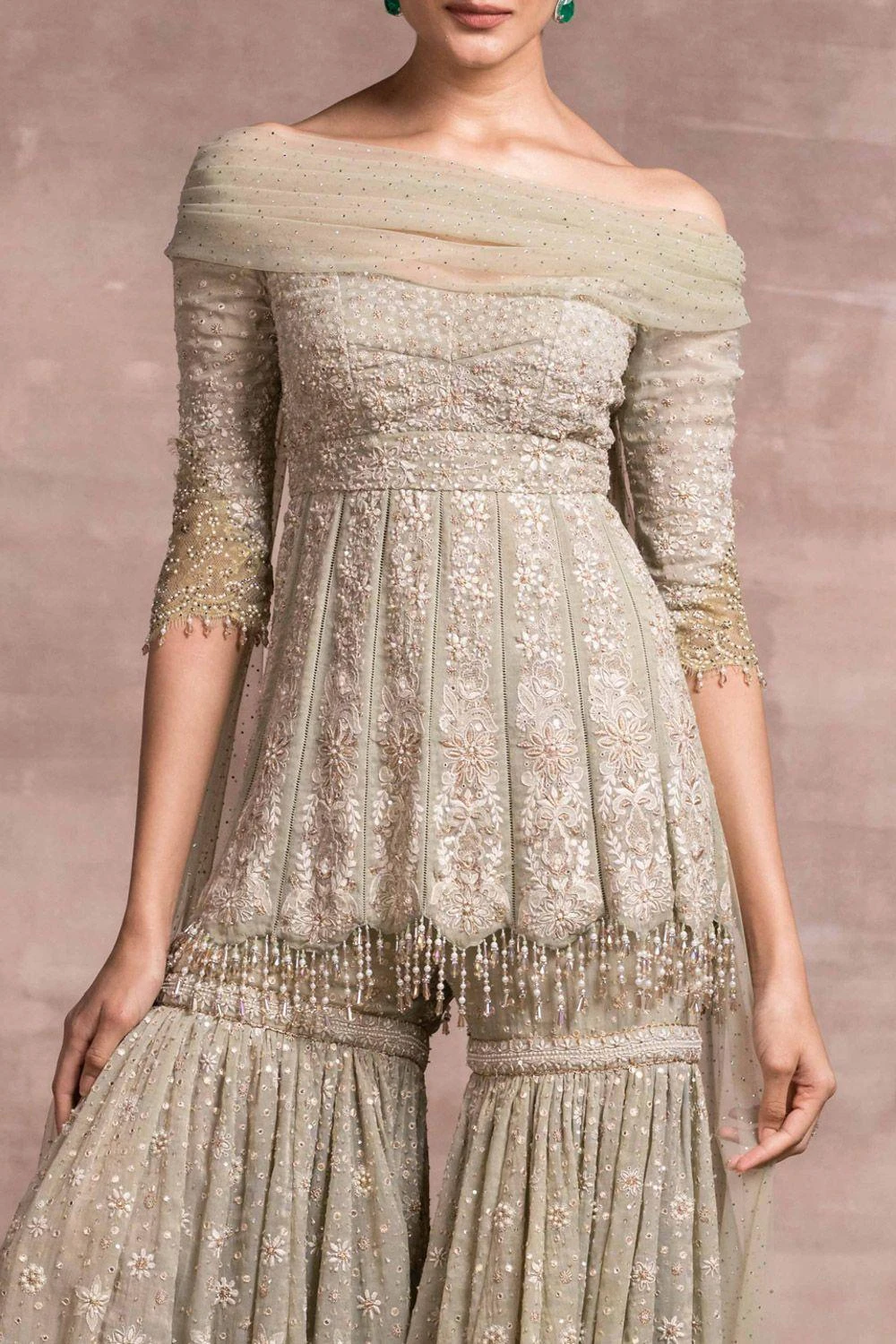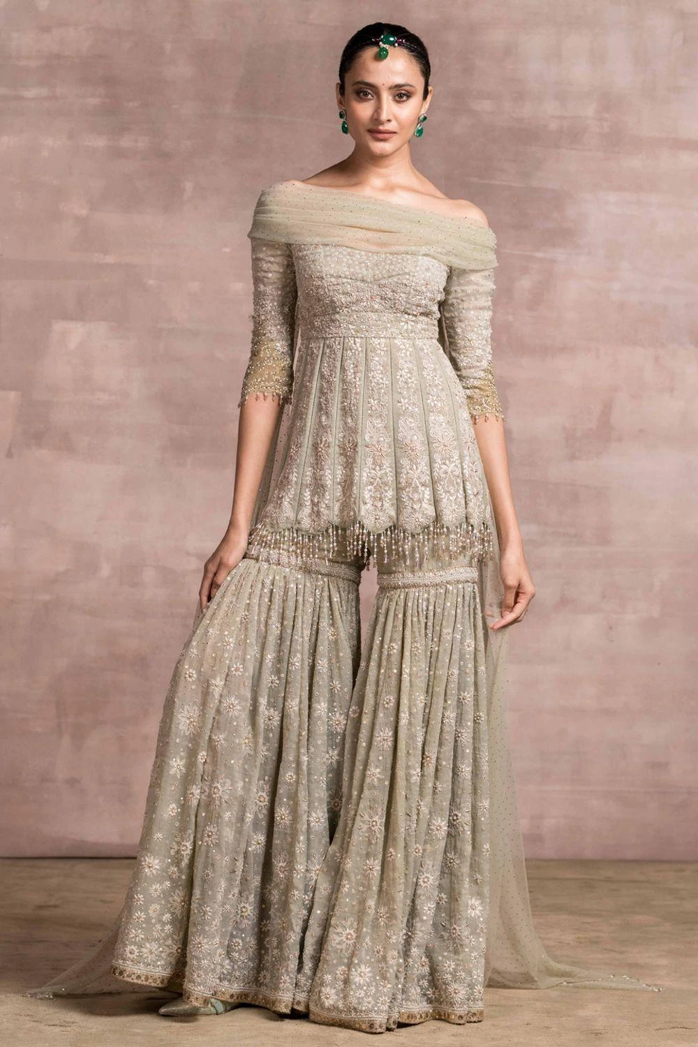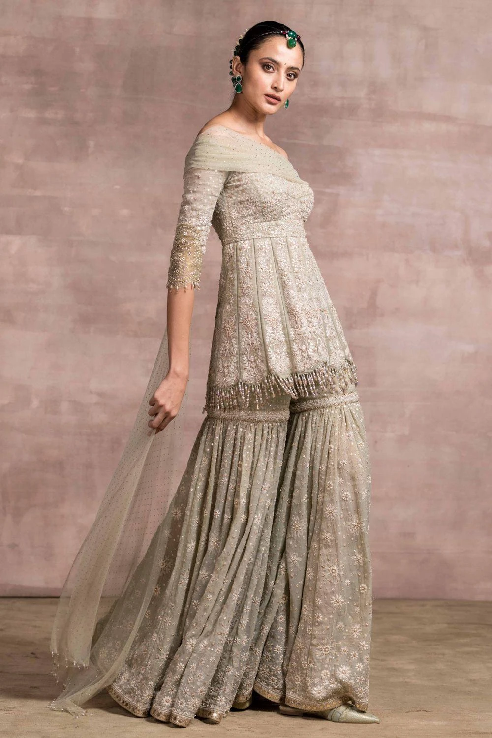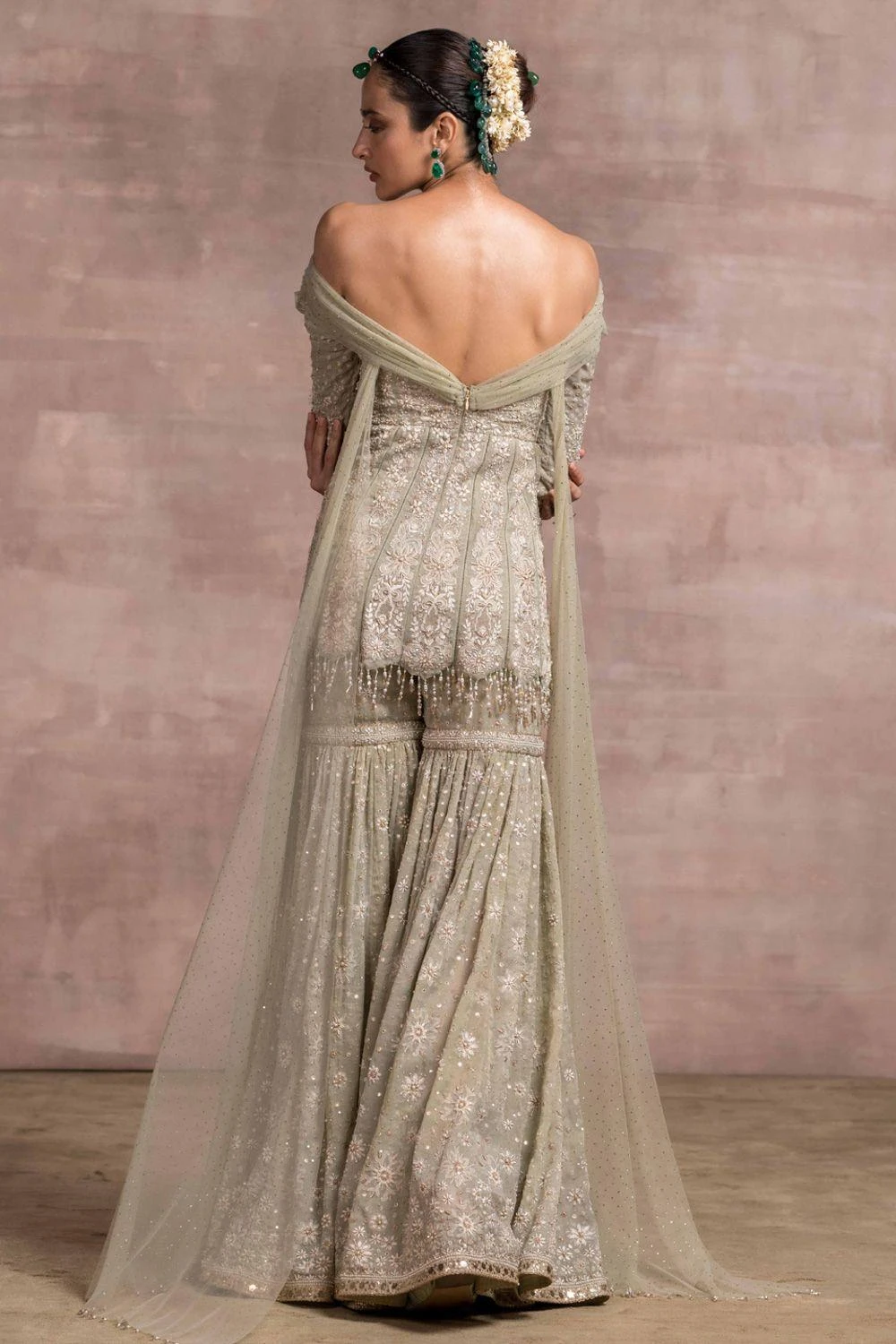 You will look equally elegant and whimsical in this jade green embroidered sharara set. It features a chikankari embroidered short kurti made in tissue georgette with a draped neckline & tulle wings. It is paired with a 14 kali matching sharara.