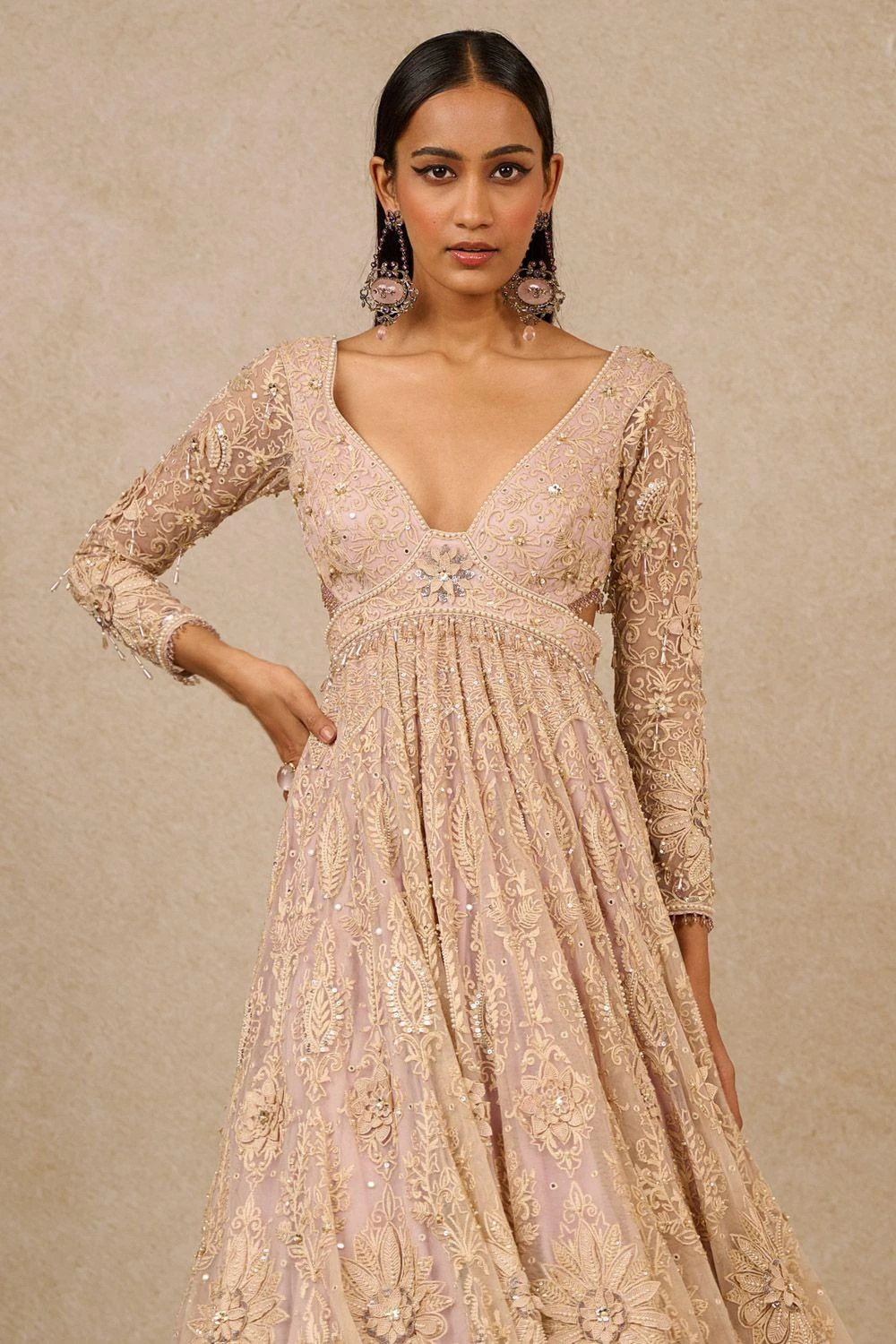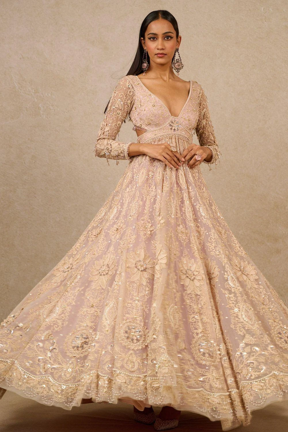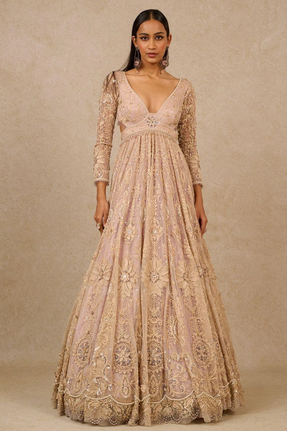 Embrace timeless grace in this soft net boat neck gown, adorned with exquisite pearl and sequin embroidery on the body and sleeves. Elegance elevated to perfection.
