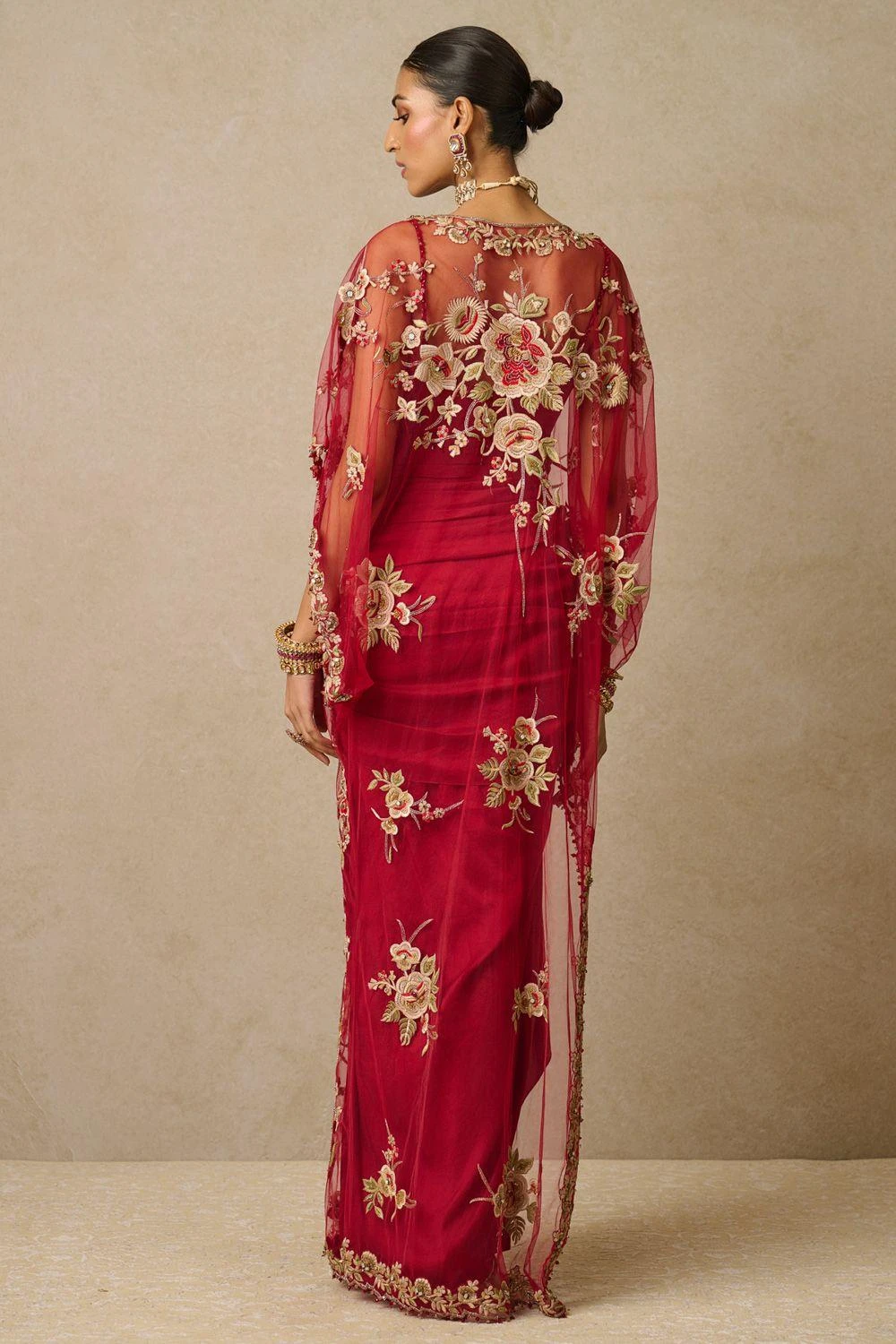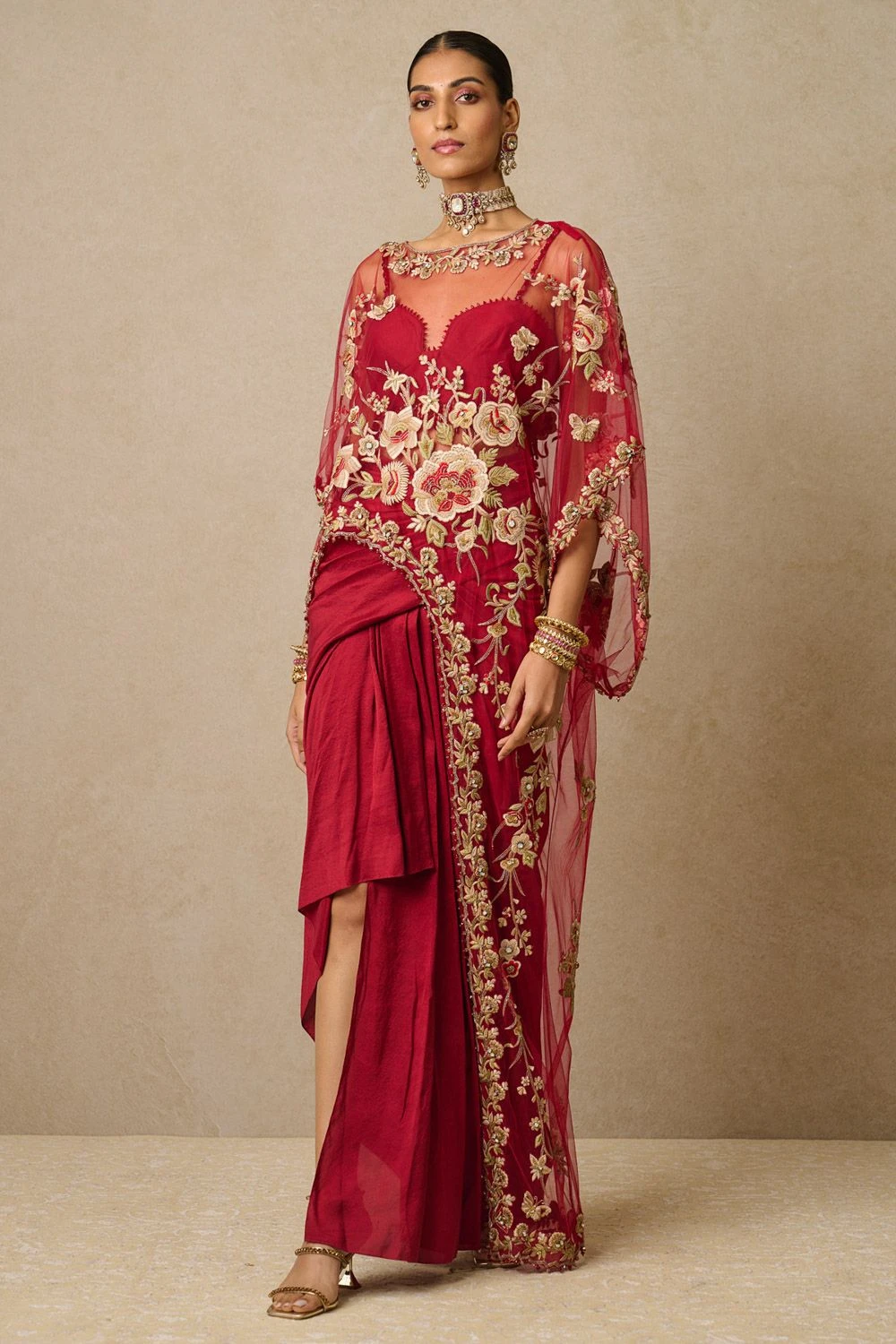 Embrace elegance in this multi-coloured gara floral cape. Enhanced by satin embroidery, French knots, 3D florals, and shimmering crystals. Paired with a chic draped skirt & a bustier, creating a mesmerizing ensemble that exudes sophistication.