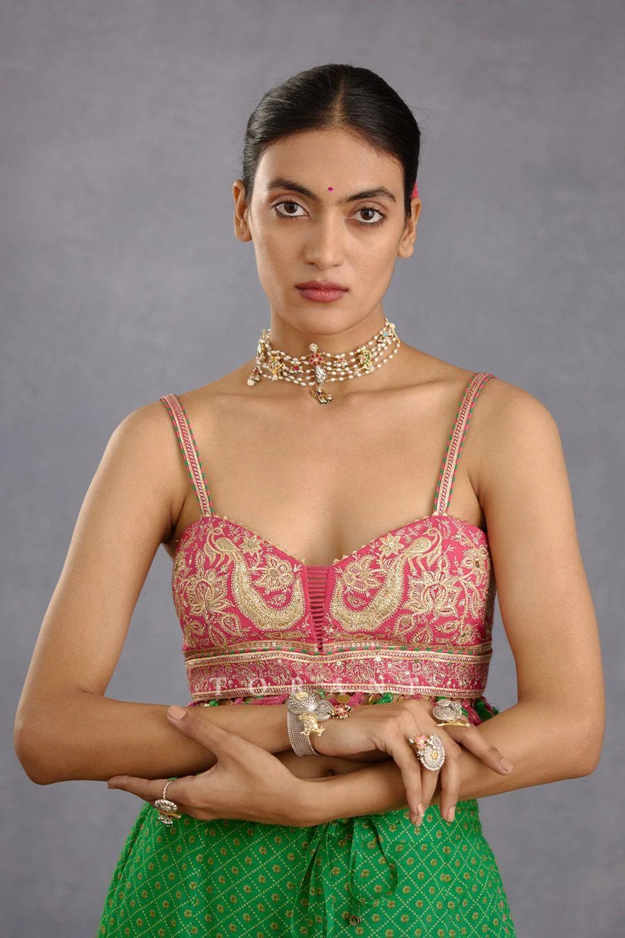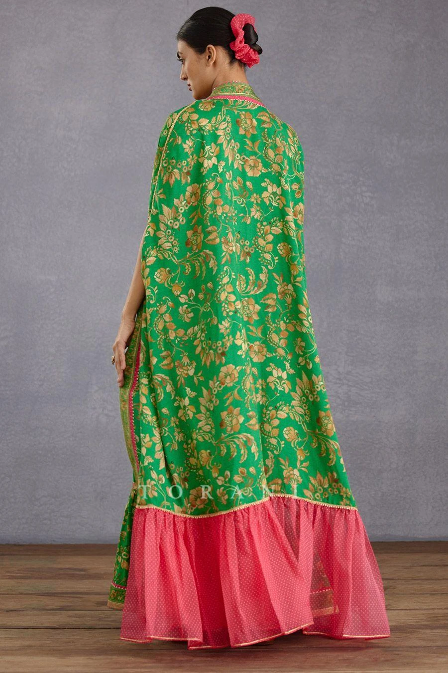 The perfect amalgamation of style and comfort, this sharara set work across occasions. Crafted in slub silk, this set features a chintz printed sharara paired with a coordinating blouse and cape.