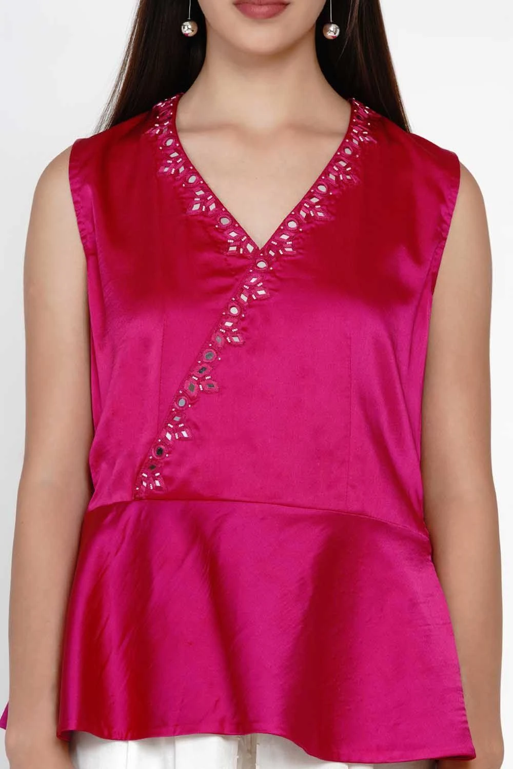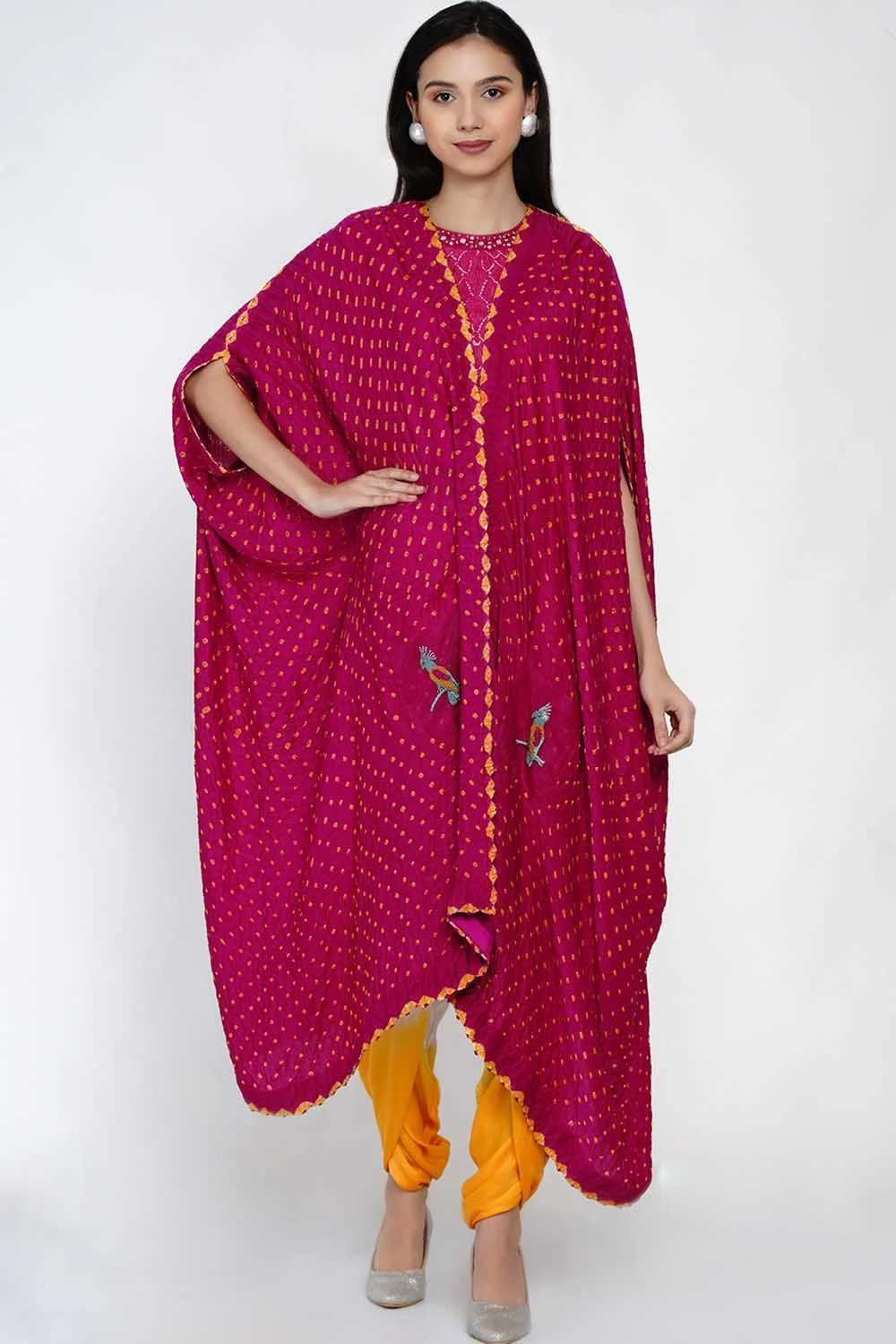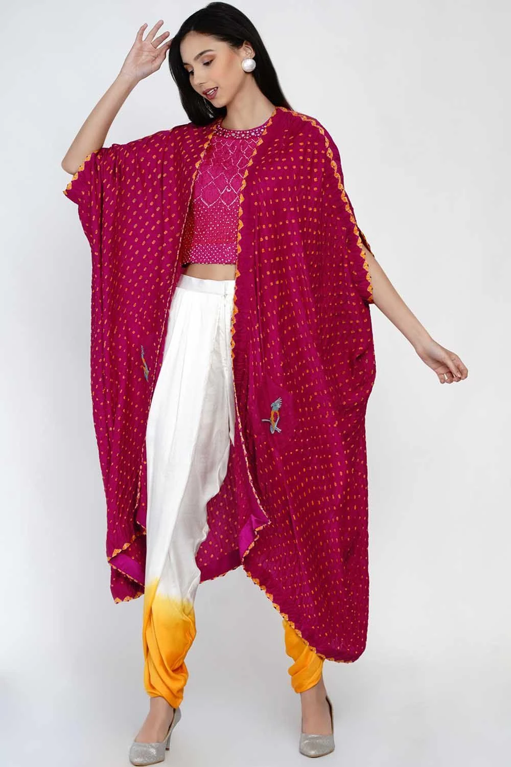 This embellished gajji silk bandhani cape set comes with ombre dhoti pants, a satin mirrorwork inner & a crushed bandhani cape. Style this look for a mehendi function with an understated clutch & heels.