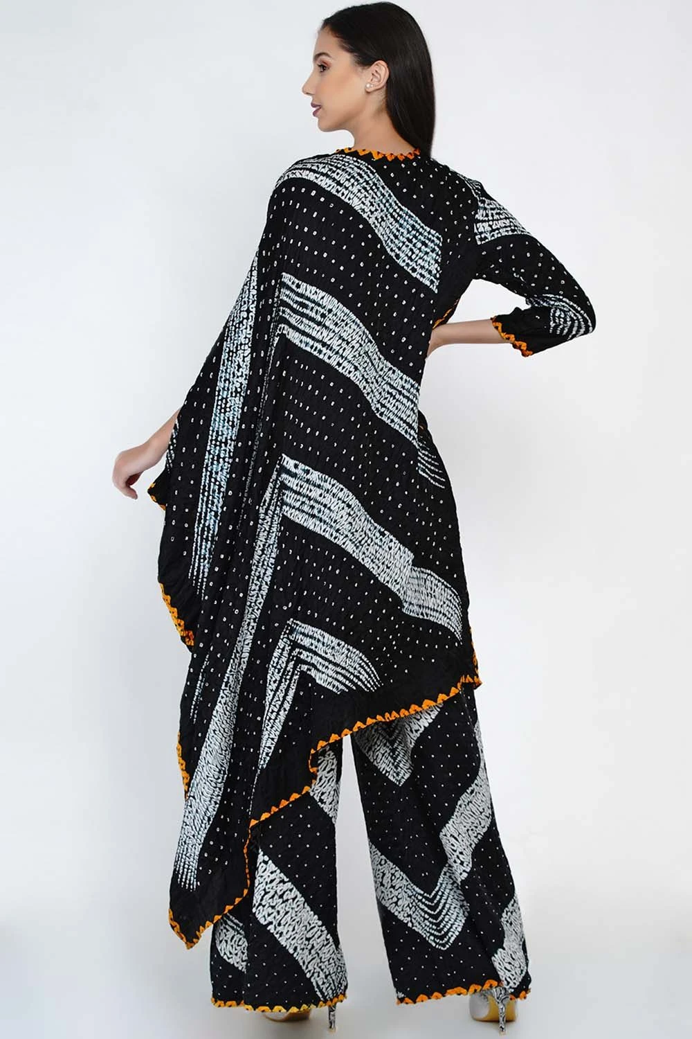 This one of a shibori silk co ord set comes a a draped cape & flared pants. This piece is dyed using bandhani techniques. This piece is perfect for mehendi functions & festive occasions.
