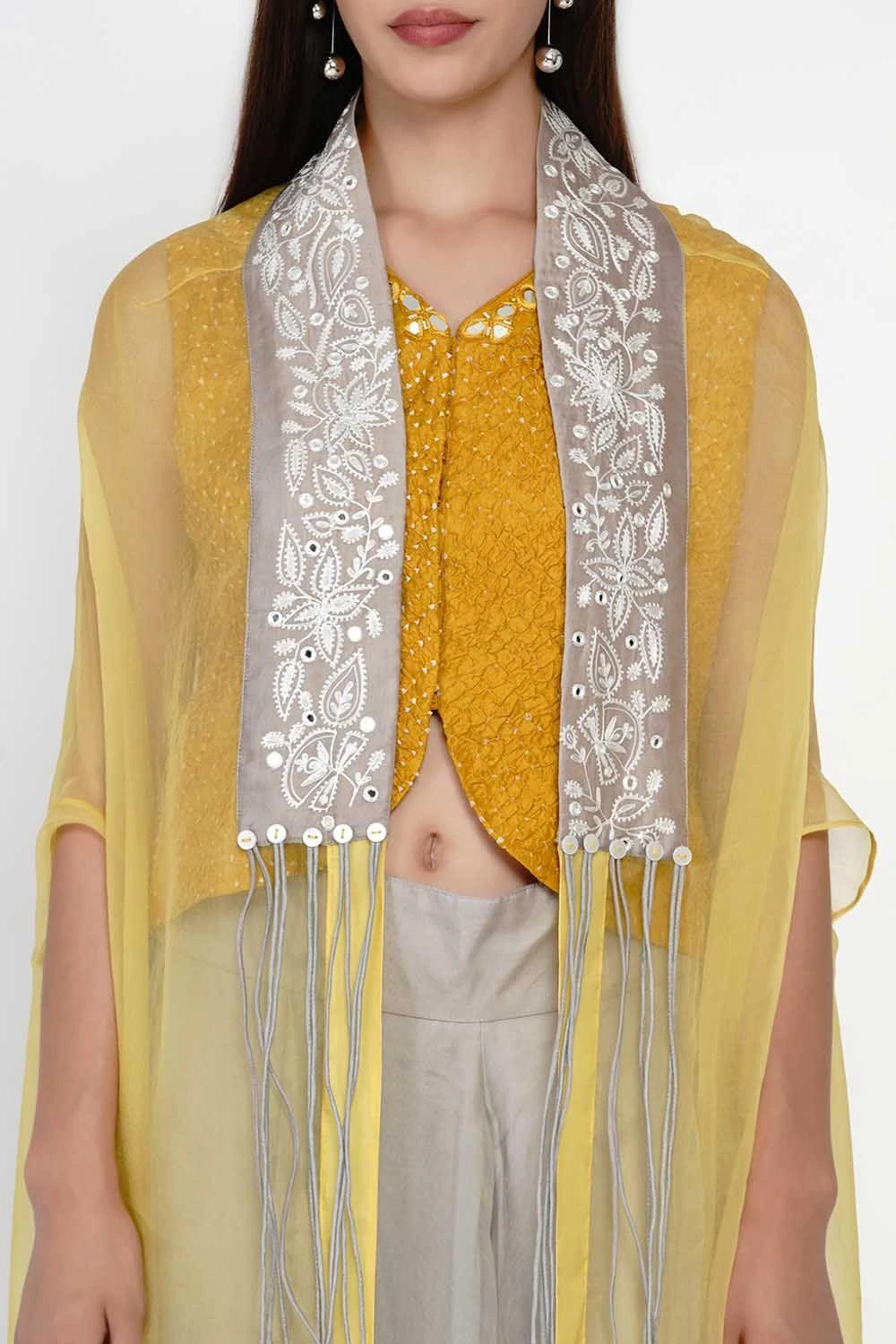 This yellow organza sheer cape will add a whimsy touch to your festive wear. It is embellished with mirror & bead work on the lapel which enhances its whole look. Style it with a dhoti set to make a flair.
