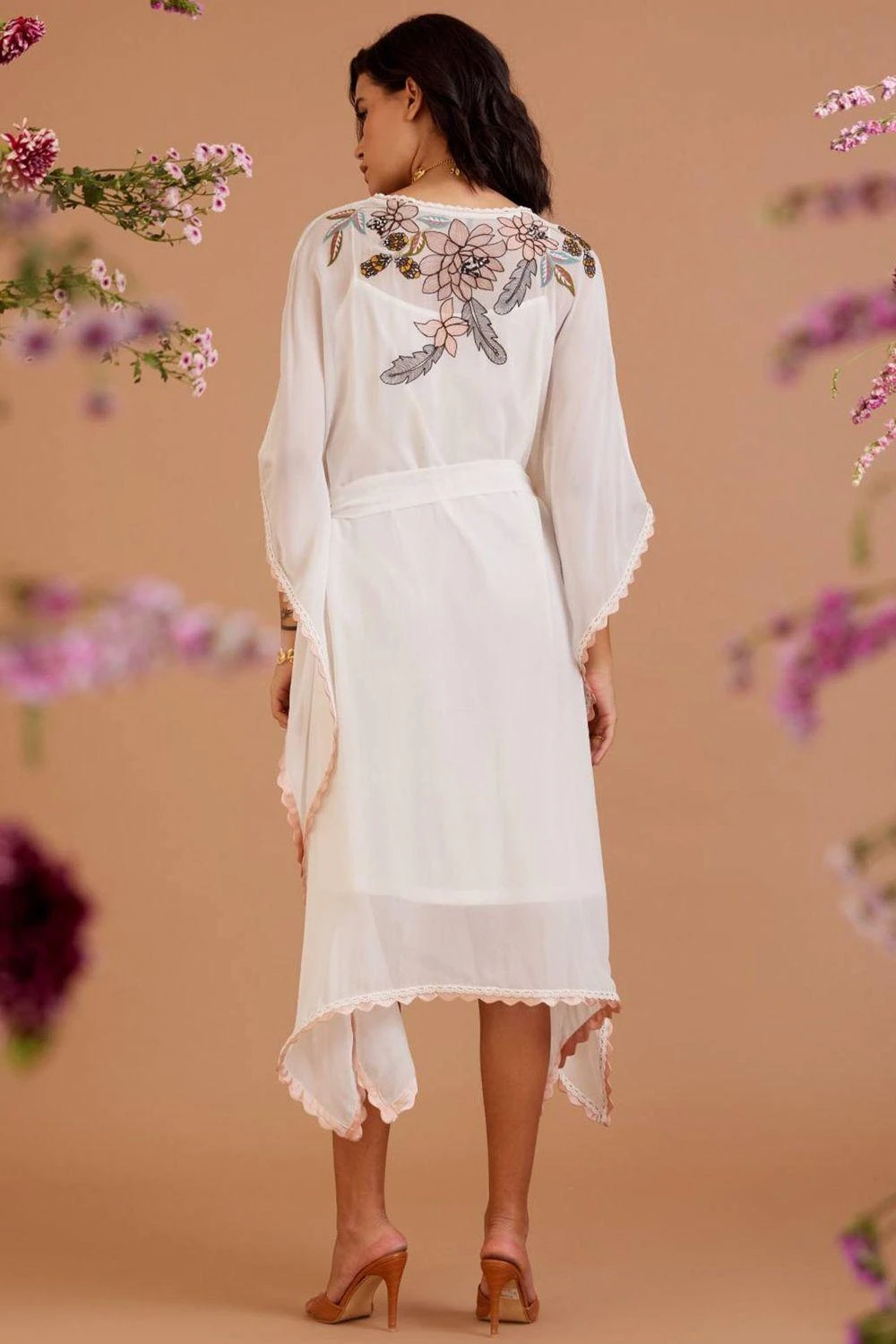 Embrace elegance in this georgette kaftan with a flowy, luxurious feel. Intricate embroidery on the neckline creates a captivating contrast against the white fabric. Delicate scallop and lace details add a charming touch.