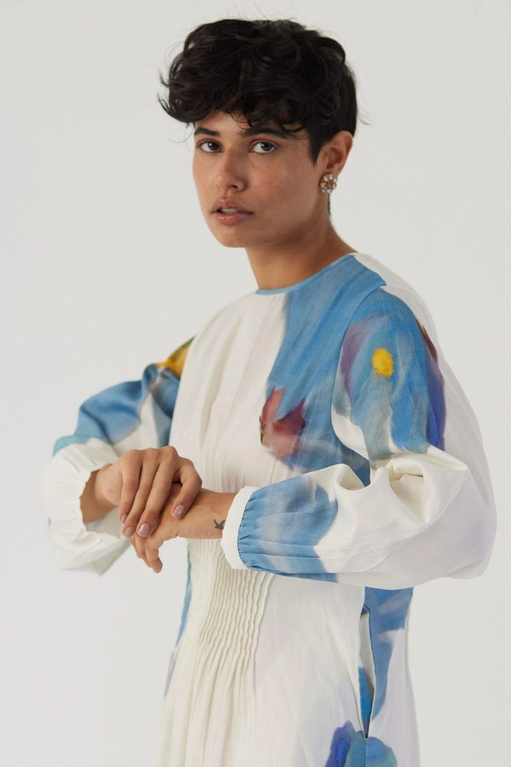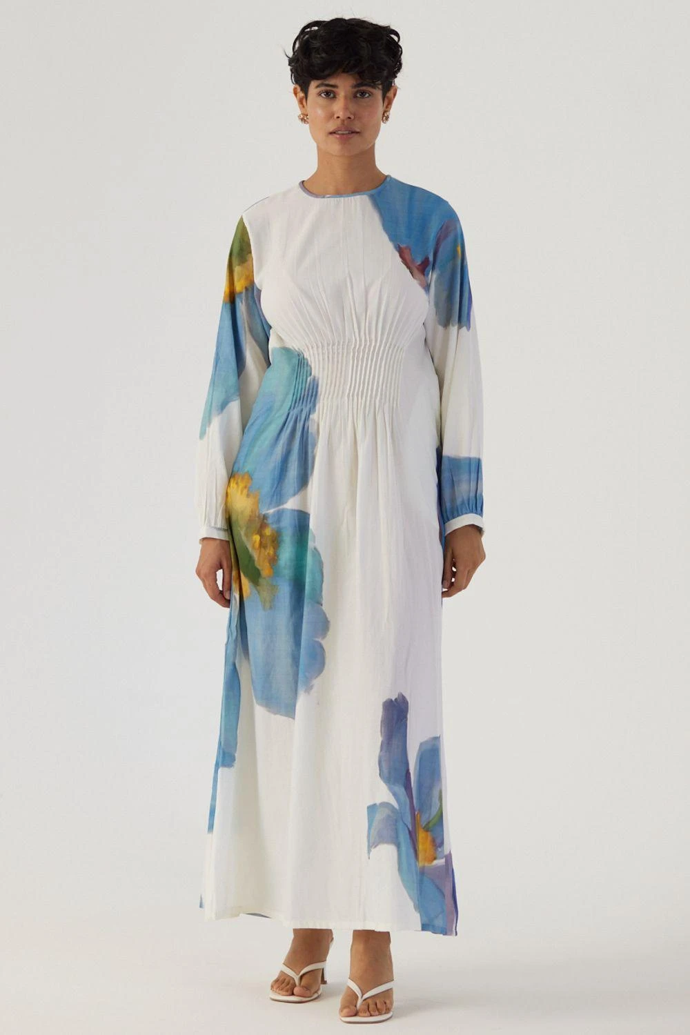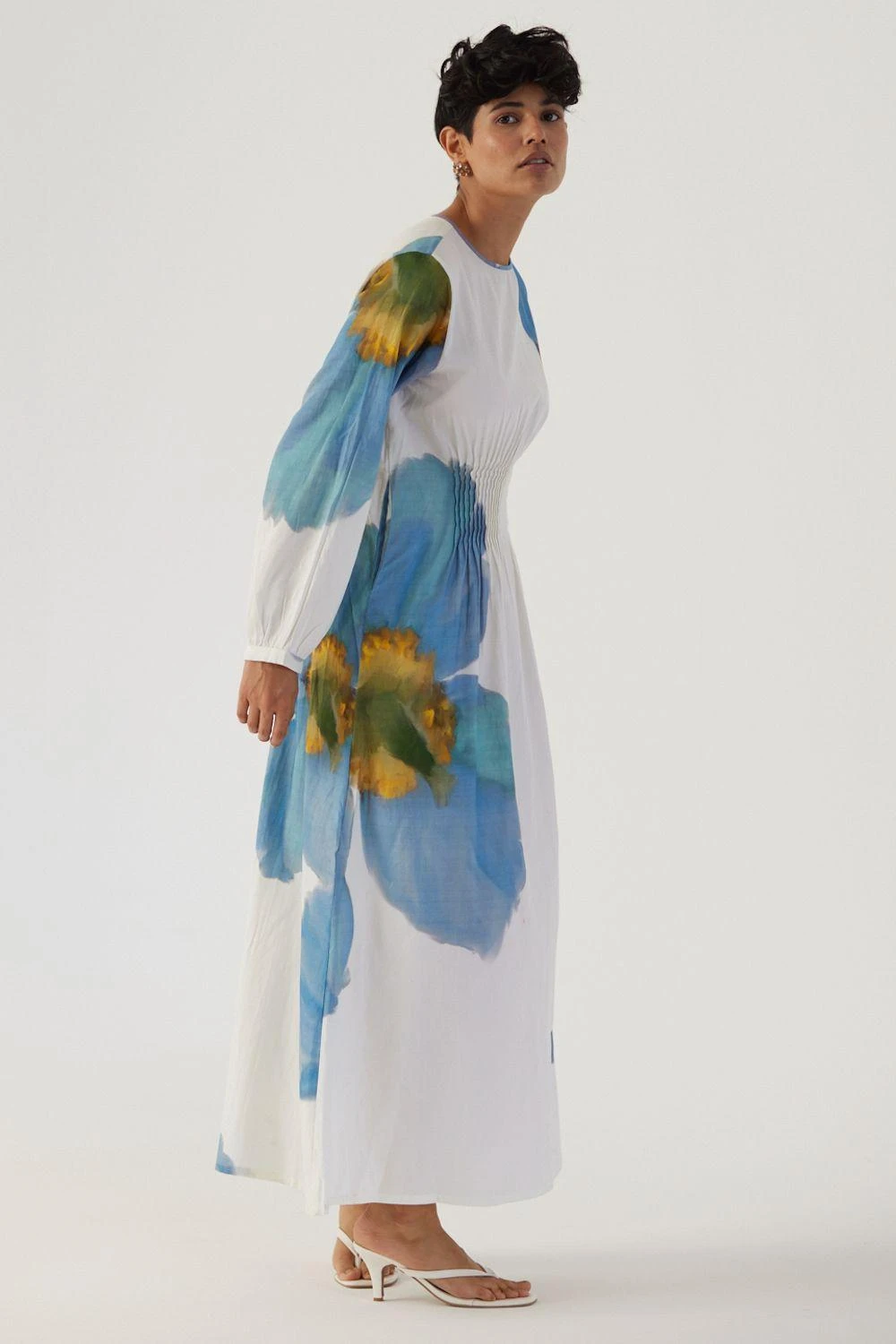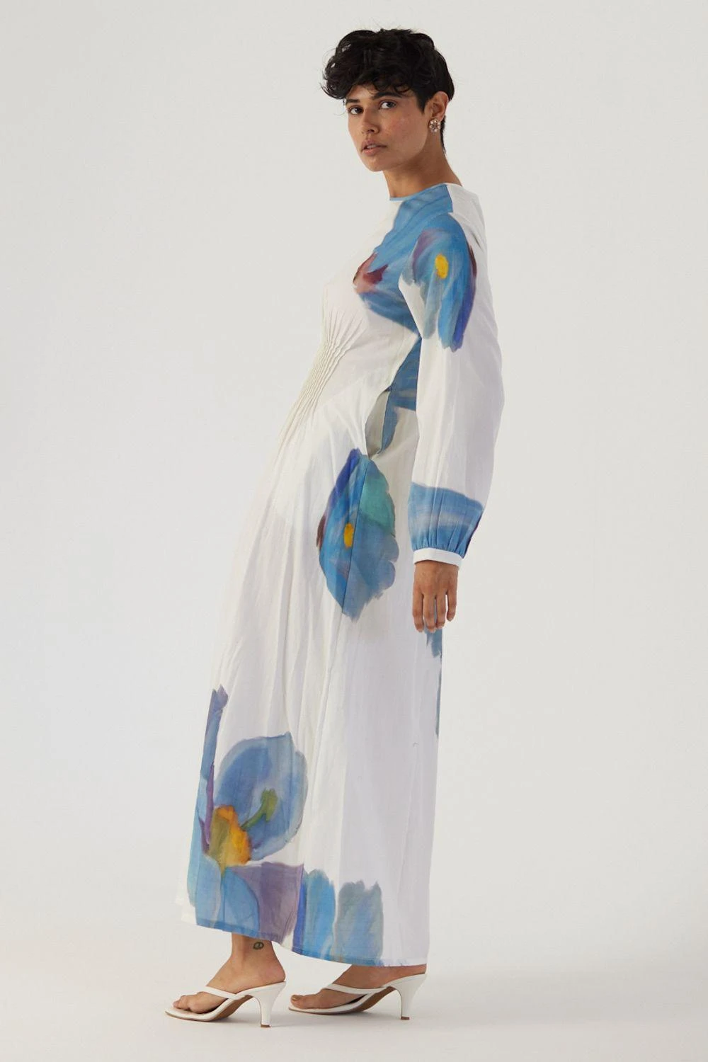 Indulge in the grace and allure of this white dress adorned with stunning blue poppies, meticulously printed on Cotton Satin. This captivating piece effortlessly combines elegance and style, making it a must-have addition to your wardrobe.